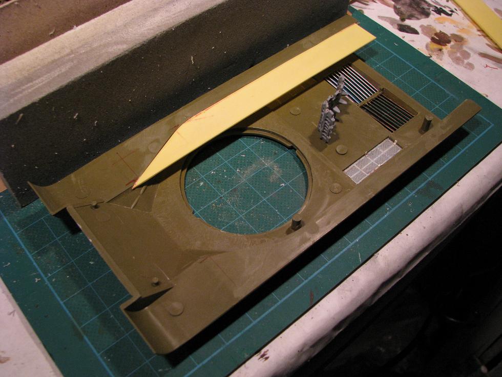 На этот раз работа велась с надгусеничными полками. Раздумывая как их лучше зафиксировать пришёл к решению подклеить куски литника в качестве опор для полос полистирола.