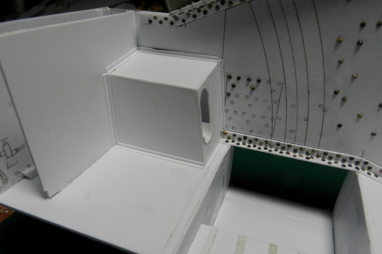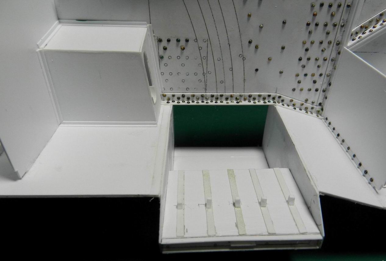 Но продолжаю. Склеил из листового полистирола ростру с блоками для подъёмника. Попробовал подвигать подъёмник по ней. Собственно делалось это для того. чтобы просто представить как он поднимался вверх, к заряднику. Всё получилось по схеме. Но стоять он будет в самом низу (как на фотографии).