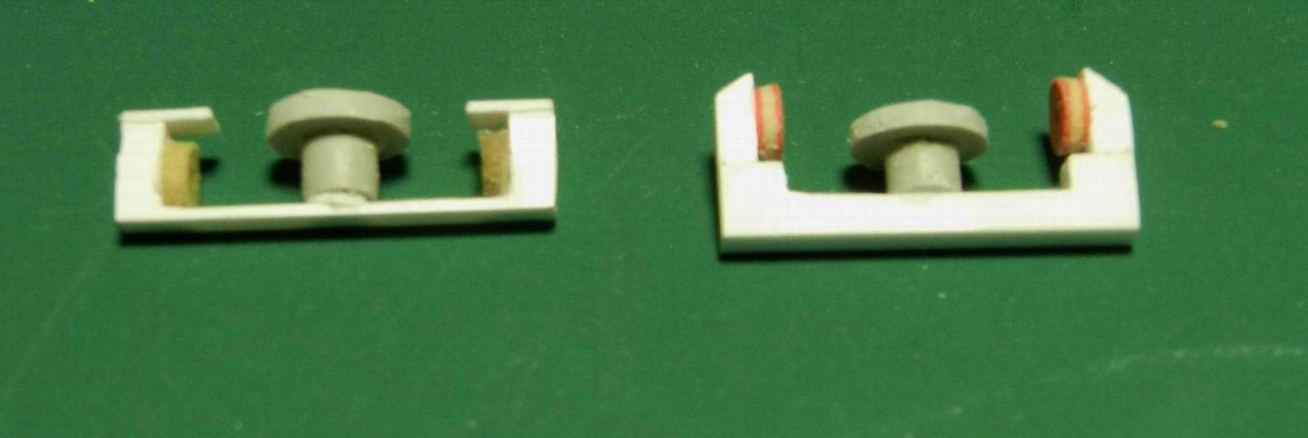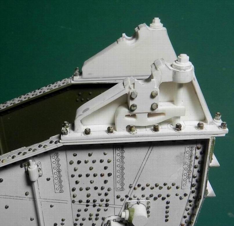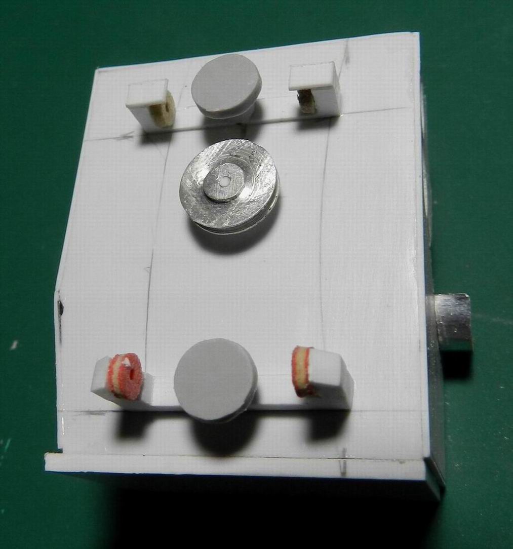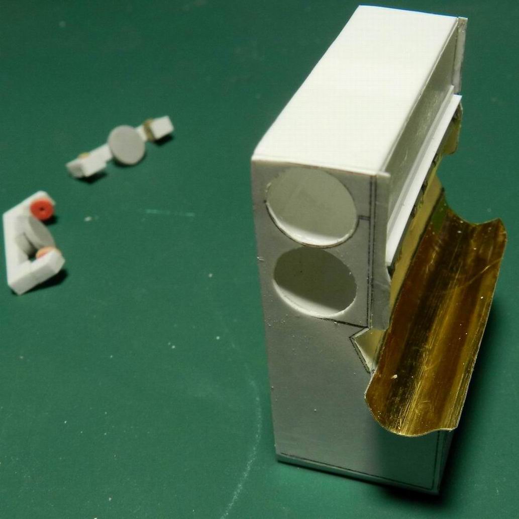 Далее собственно подъёмный механизм. С его помощъю полузаряды и снаряд поднимаются к механизму заряжания. Для начала сделал катки с кронштейнами для прокатывания подъёмника по ростре. Сам подъёмник собранн из полистирола и фольги. В нём размещаются два полузаряда и снаряд.Ростра с подъёмником будет крепися к левой станине. На задней стенке подъёмника приклеил кронштены с катками и блок для троса подъёмника.