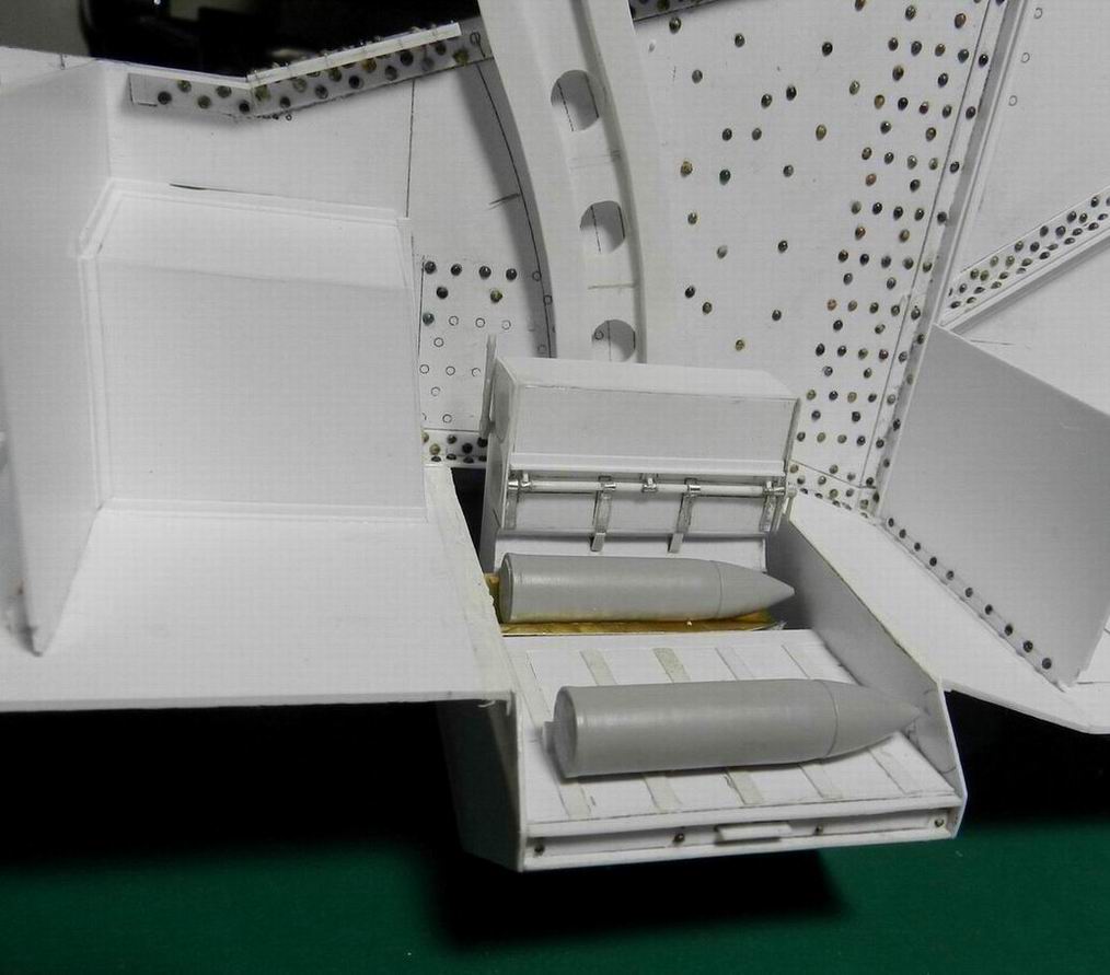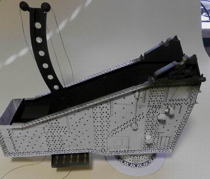 Продолжаю ковыряться с деталями размещёнными между станинами. К левой станине и задней поперечной связи крепится короб с лотком для подачи полузарядов. Практически по центру, снизу установлен короб с напраляющей для подачи снарядов с тележек снаружи. По этой плоскости снаряд скатывается в лоток подъёмного механизма.