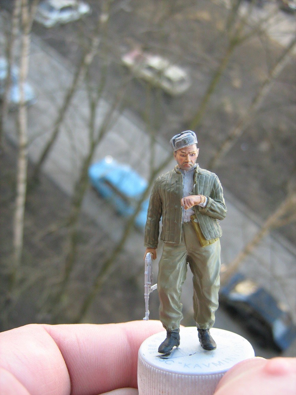 Наделил лицом ещё одного бойца.Покрасил в базу ватник и штанцы.Фигура несколько крупнее своих собратьев,а лицо,показалось,угрюмым и скуластым.Типаж кайфовый.