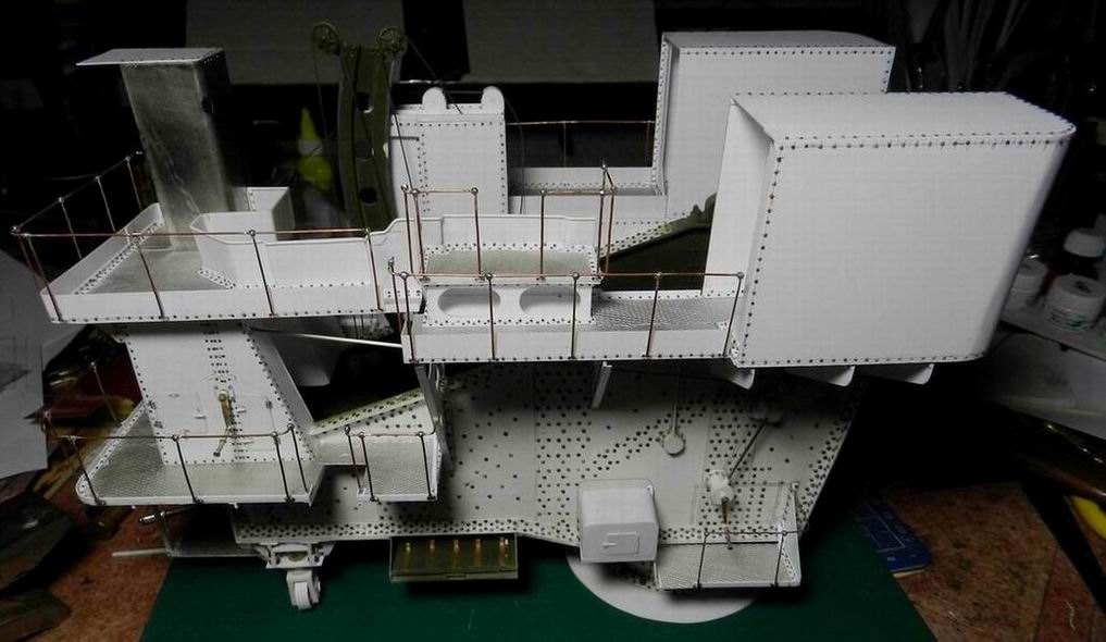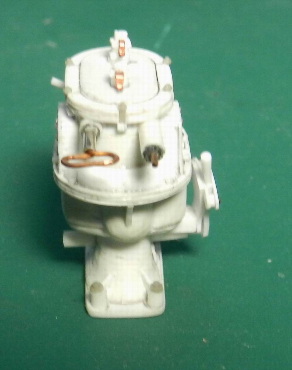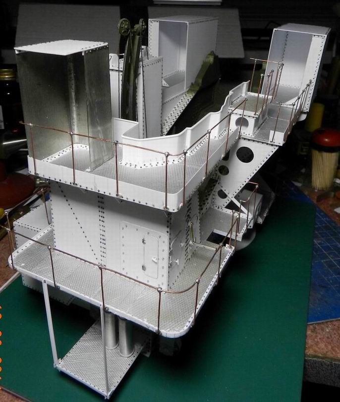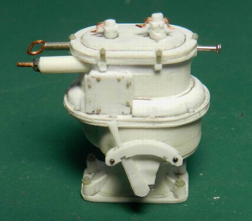 Наконец разродился следующими деталями по модели 305 мм. орудия. Изготовил две рубки для постов горизотального и вертикального наведения. Кроме того сделал рубку для поста управления огнём с площадкй. А также правую верхнюю площадку. Временно установил всё на журавль. Клеить буду после изготовления приборов и покраски нижней части.