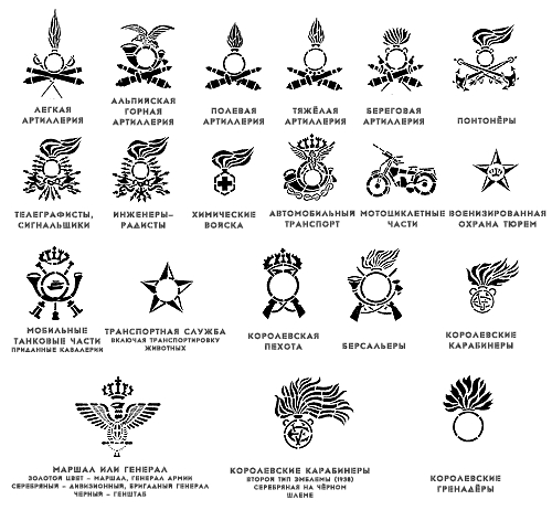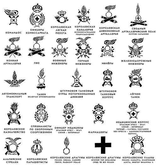 Что до кокард - думаю, могли использовать традиционные эмблемы родов войск.