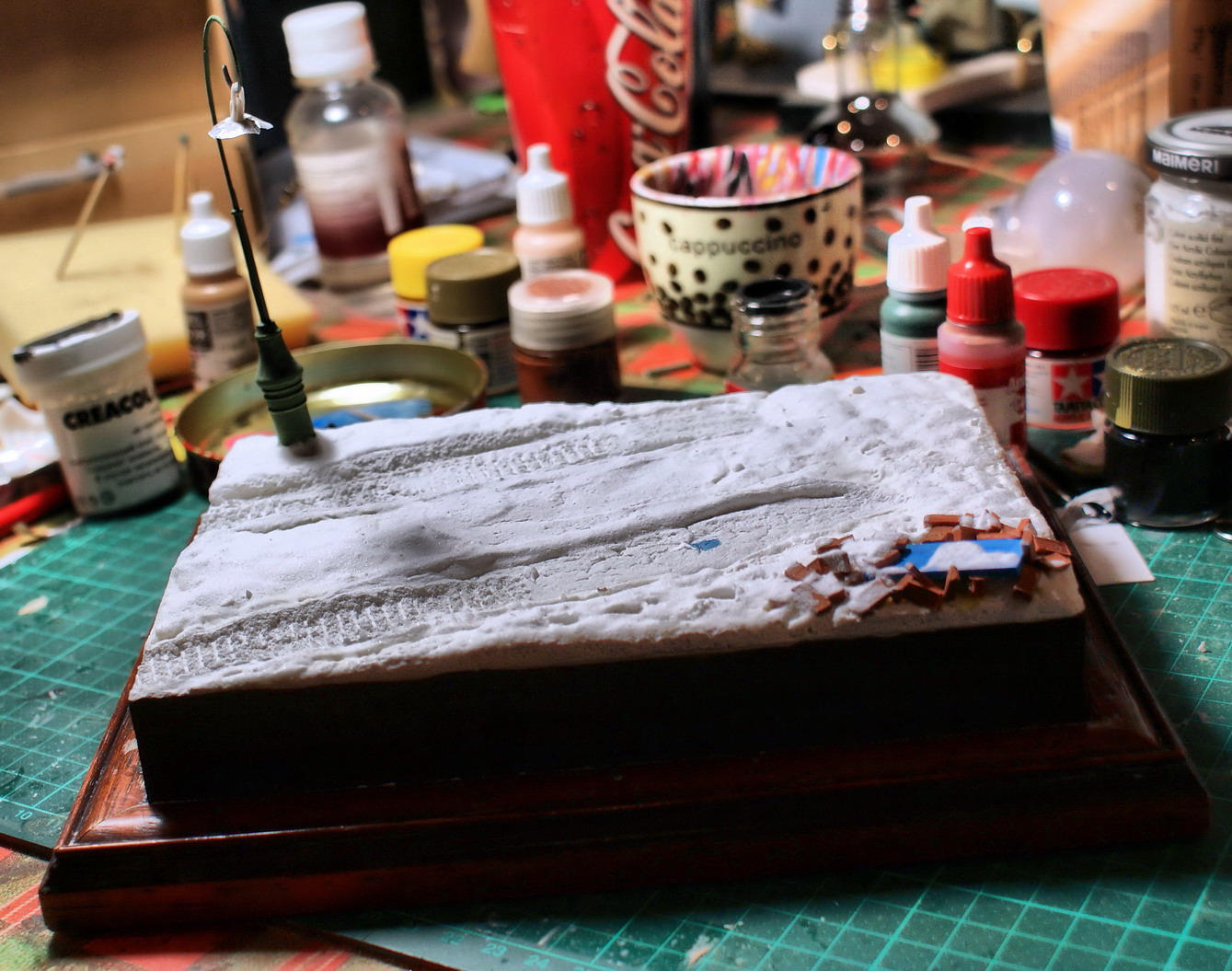 После нанесения «снежной» массы, хорошо бы было немножко пройтись водой из аэра, это сделало бы рельефные переходы снега более плавными, мне кажется это придало б реализма(ИМХО)
