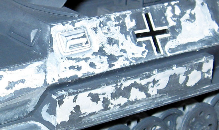 3.Как краска слегка подсохла обкалупываешь хаотично (но с присутствием логики - там где больше вероятность обдирания камка- гдеступала нога солдата, ветка дерева царапала,болтающийся трак протер и тд.)