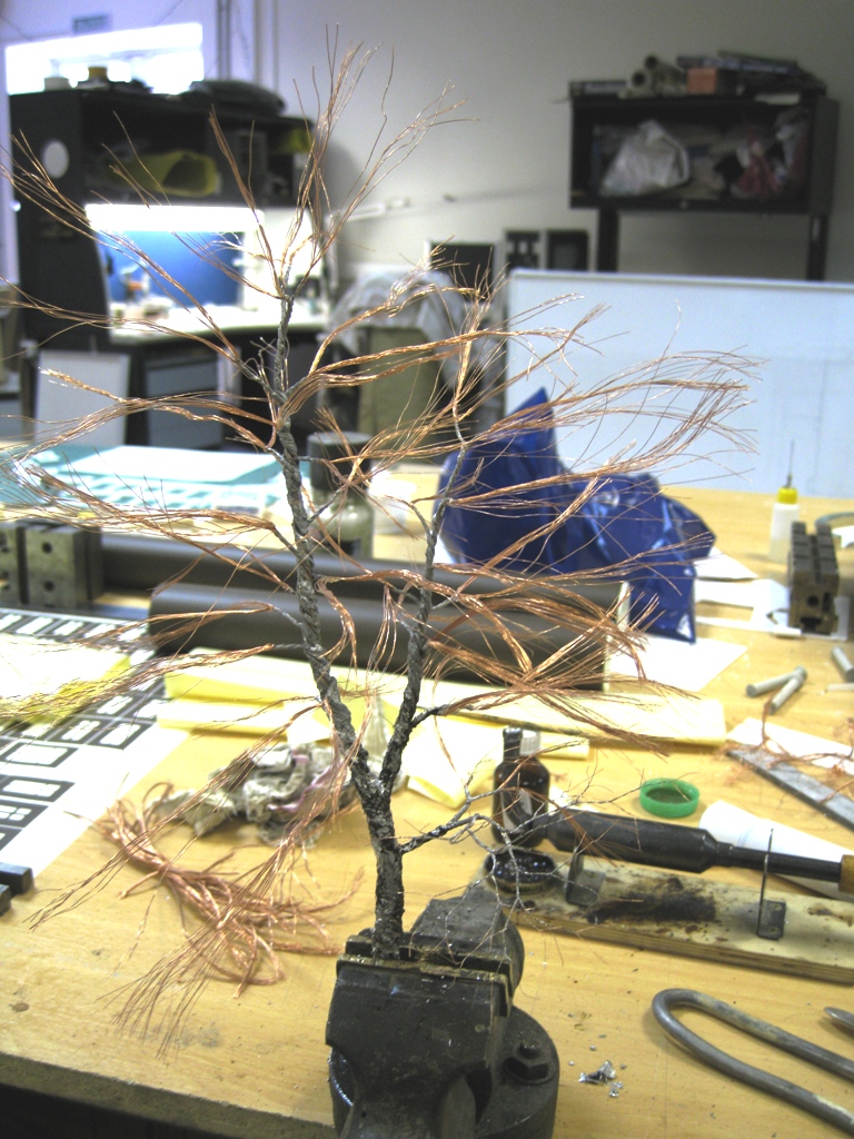tankist, все очень просто. медные многожильные провода очищаются от оплетки, нарезаются длиной в зависимости от высоты задуманного деревца. + 50-100мм. (запас на ветвистость и изгибы) скручивается все и оппаевается, удобнее начинать с корня, точнее с той части которая будет втыкаться в почву (подмакетник) далее зажимаете этот пучок в тиски и понеслось! а проводочки лучше брать как можно тоньше! тогда более изящные веточки получаются.