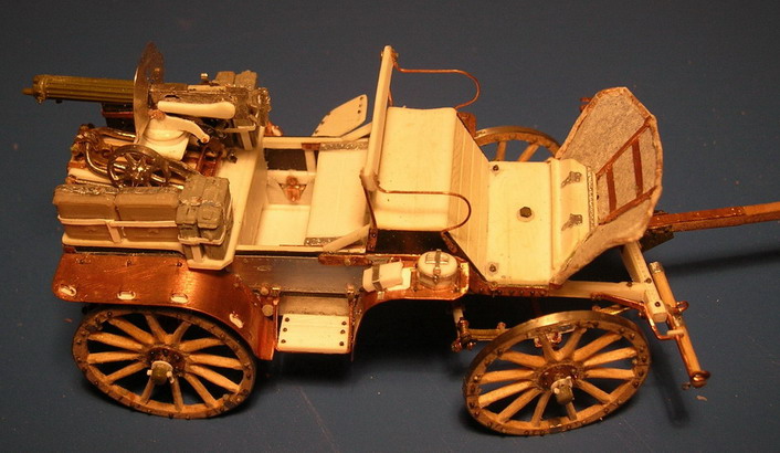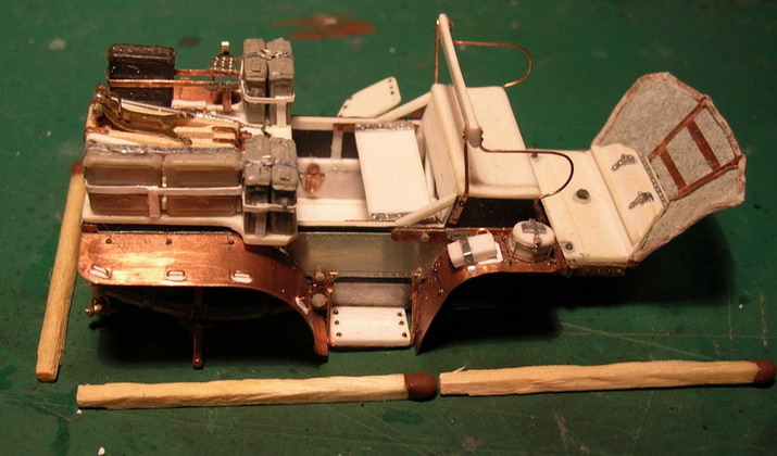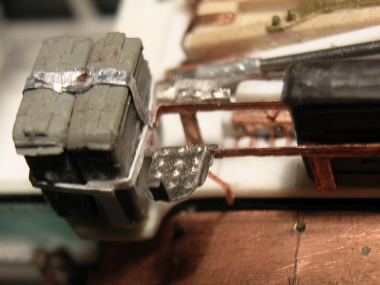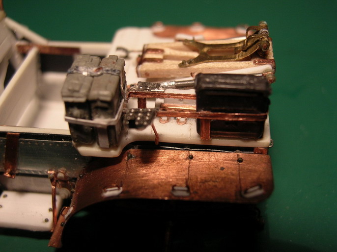 Всё ближе развязка.Она может быть трагичной для модели. (Это я элемент триллера пытаюсь внести).Установил коробки слева ,со стороны заряжающего. Изготовил из фольги столик для постановки коробки с лентой в положении для стрельбы. Одну коробку сделал открытой с имитацией ленты. Она будет прикрыта крышкой, которую будет придерживать заряжающий на ходу.