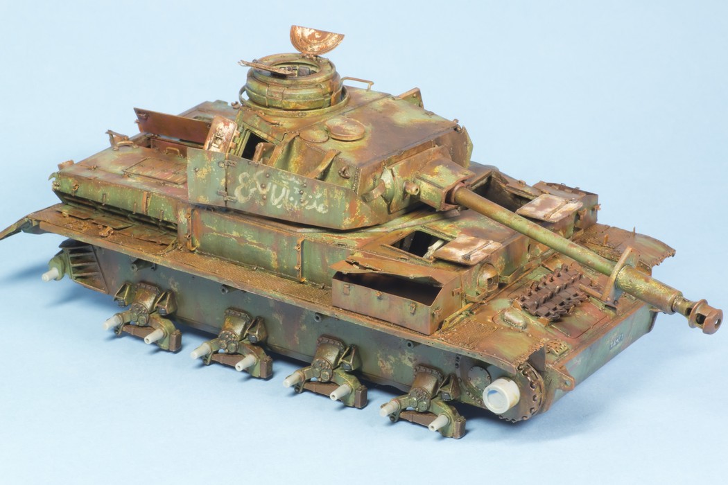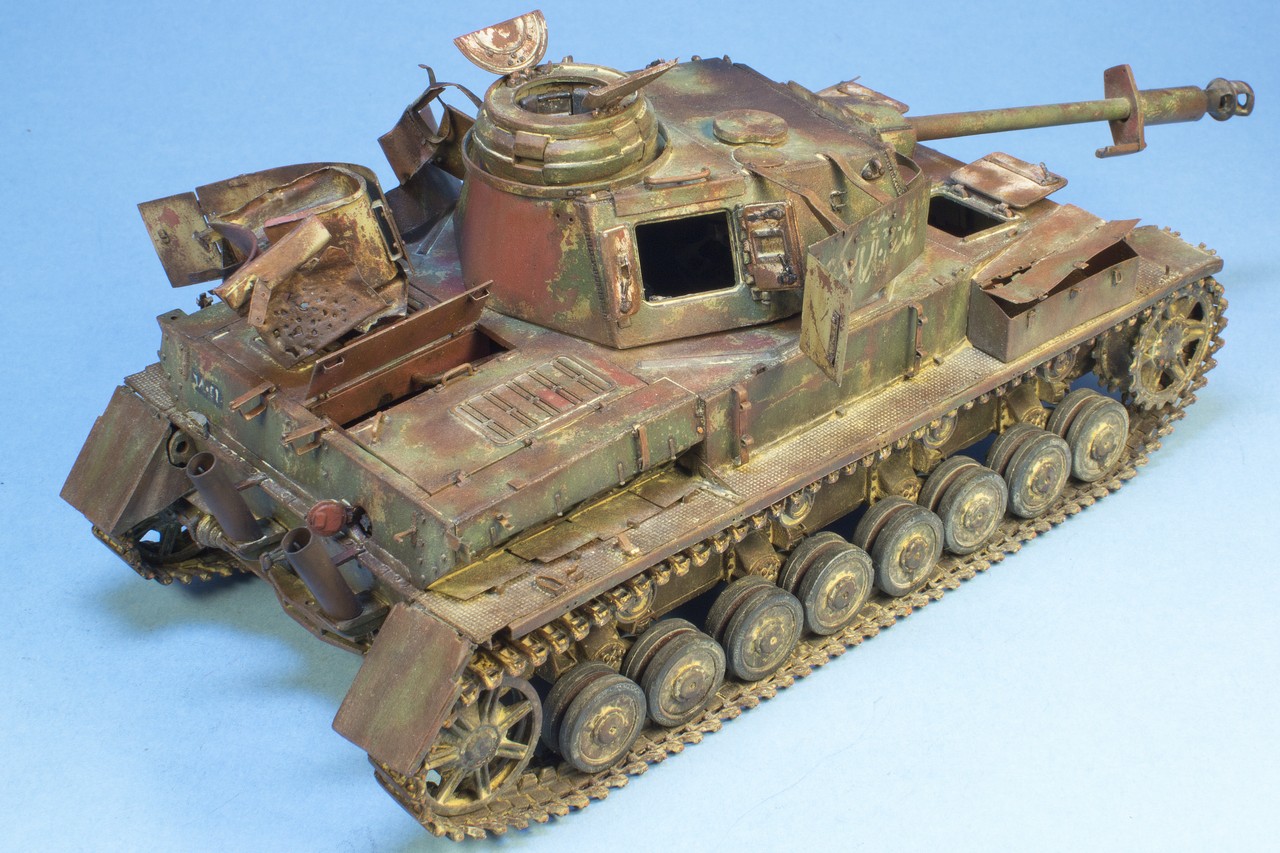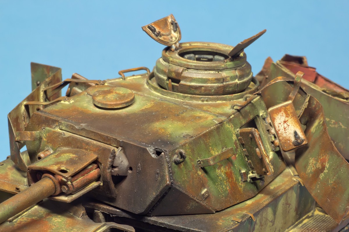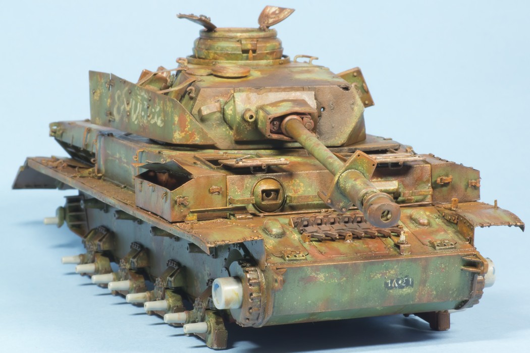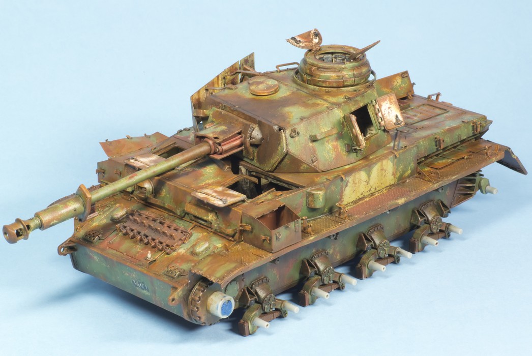По крупному, закончил "ржавление" корпуса и башни. Использовались масла и жидкости от MIG и AK. пространство под полками дополнительно затемнил тамиевским Smoke.