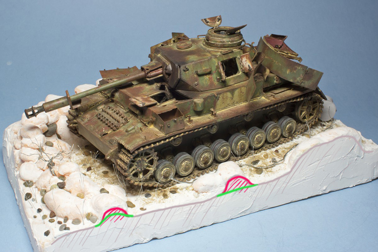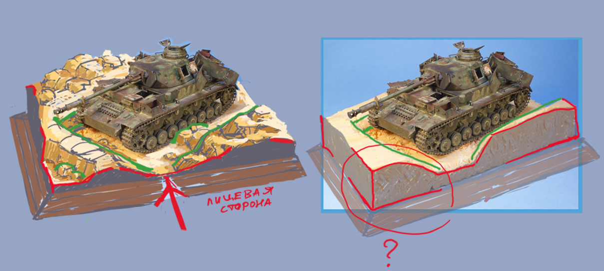 ). С капониром - хорошая идея, а вот с обрезом пока вопросы. Те ракурсы, которые ты выбрал - смотрят на зрителя углами основания. Мне кажется это не супер - особенно тот угол, который я обвел. Во-вторых, с помощью основания можно решить проблему с "аккуратными" катками. С одной стороны танка капонир может близко подходить к танку(кстати как на прототипе)пару камней с этой стороны можно положить на крылья, с другой стороны несколько камней положить близко к каткам, чтобы нарушить ровную линию между катками и основанием.