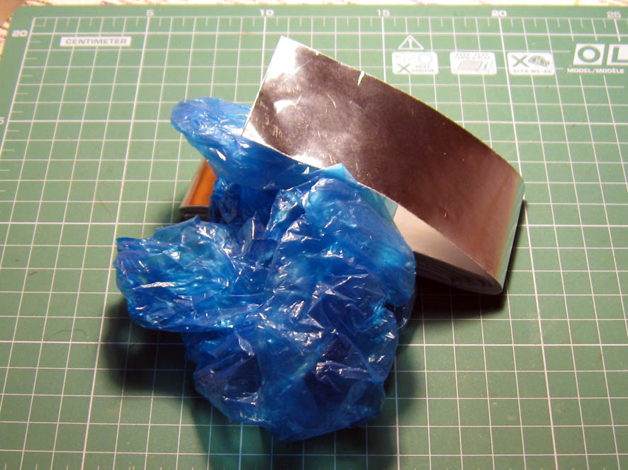 Исходники те же- тонкая фольга(с клеящим слоем), пластиковая плёнка от санитарных бахил (без перфорации).