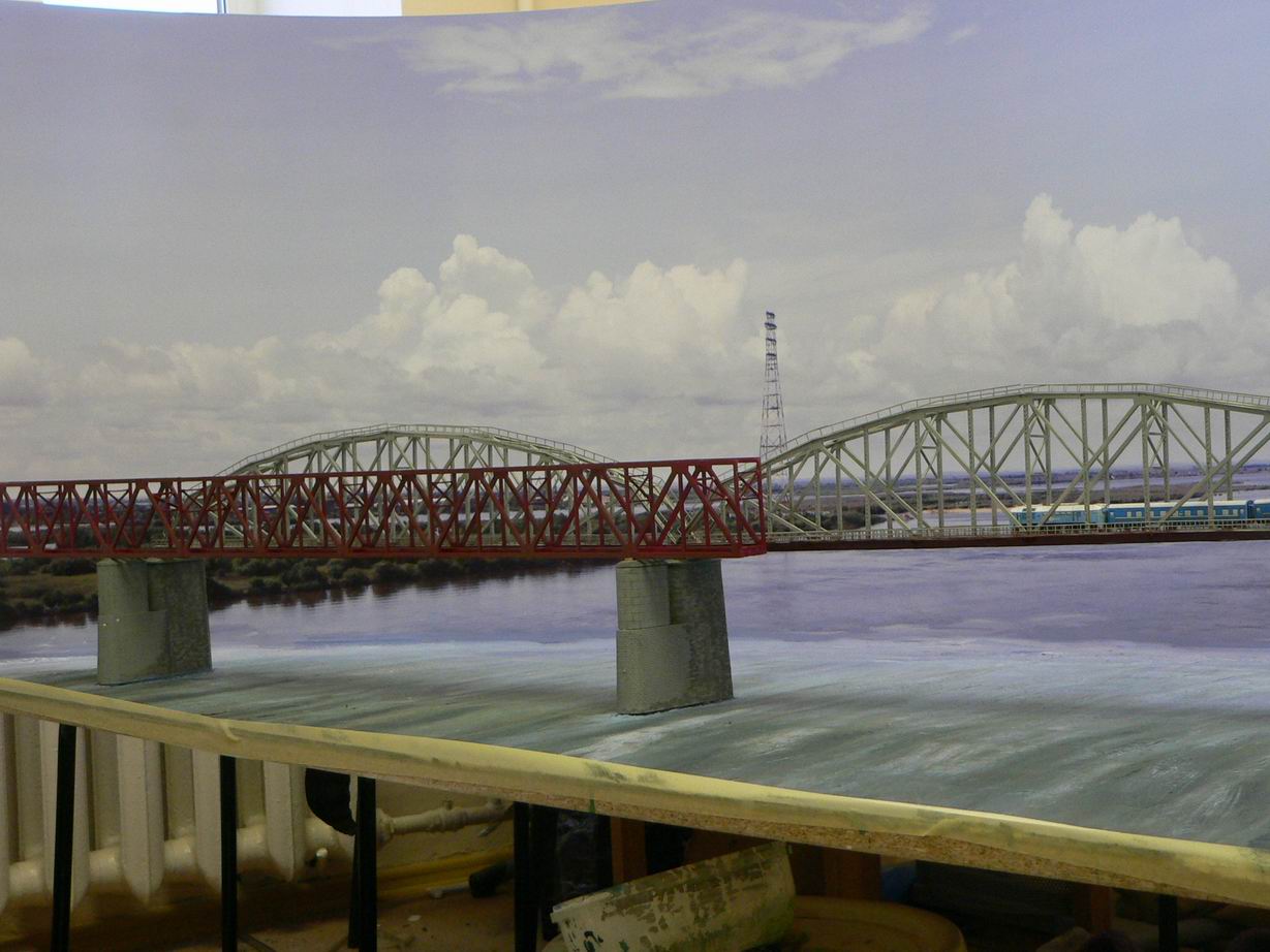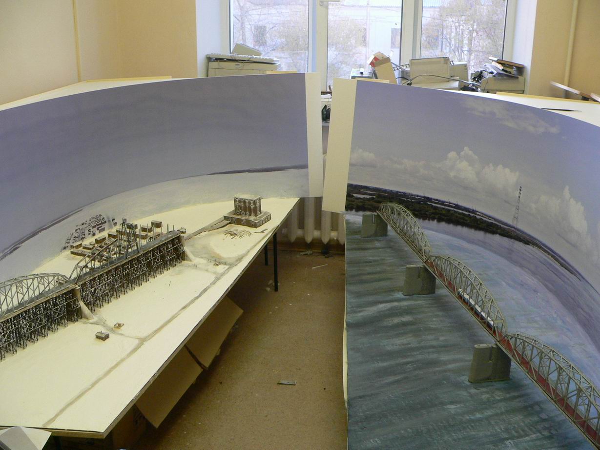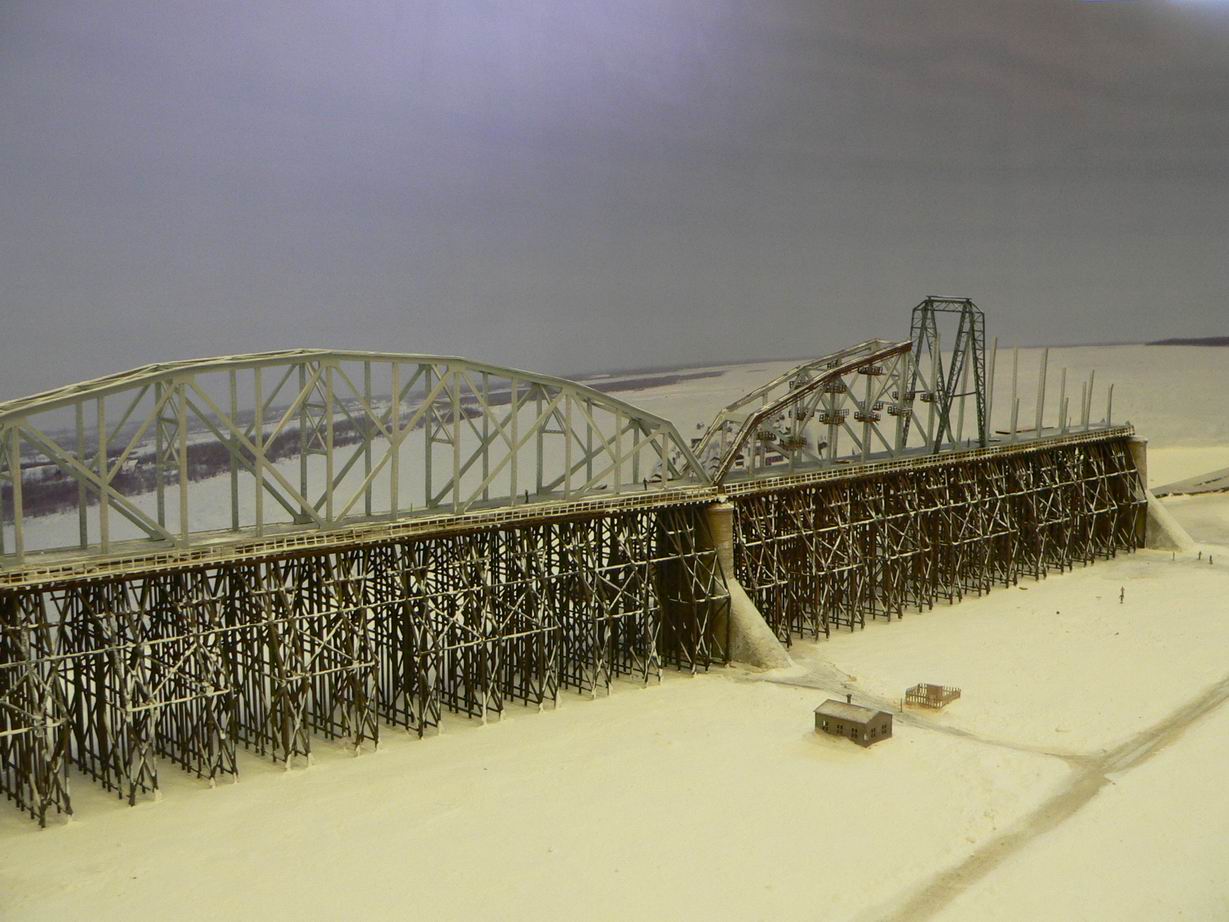 Да ,первая диорама строительство моста через Амур около Хабаровска.Хронология несколько усредненная - у заказчика было желание показать еще и технологию строительства.Но получилось выполнить момент строительства на зиму 1915/1916 года.Стройка была весьма грандиозная.А проект моста в свое время получил золотую медаль на парижской выставке.Вторая диорама будет показывать реконструкцию моста.Точнее ее первый этап.Тогда на ледоломах старого моста возвели новые опоры(представляете какой запас прочности был заложен).Параллельно старому мосту начали возводить новый.Новый мост двухуровневый- внизу идут поезда а вверху автомобили .Раньше через Амур автомобильного движения я не было.Реконструкция представлена на период 2000 года(могу немного ошибаться -плюс минус год).От старого моста в настоящее время осталась одна ферма,которая установлена на берегу,недалеко от нового.Теперь в этом месте будет музей.Уже установили паровоз,стрелки и колонку для заправки паровозов водой.Если коллегам будет интересно то могу написать статью про постройку мостов и макета.