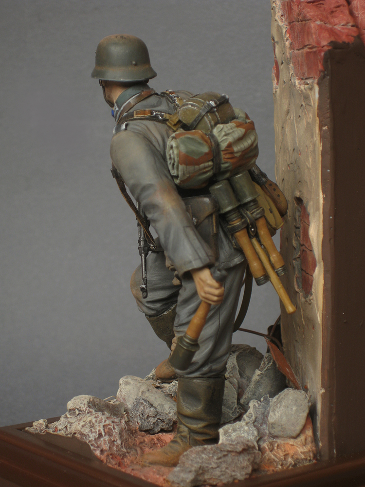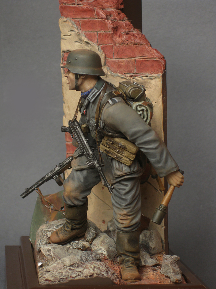 Может, стоило на этапе сборки оторвать резцом подшлемник от подбородка и повесить подсумок децл поболее под углом? На известной фотке, по мотивам которой сделана фигура, немец на ходу правым бедром и штурмаком поддает подсумок кверху и выравнивает. На фигурке этот момент почти не отражен, да и относительно ремня он выглядит низковато. А в остальном. наверное, лучше и не сделать.