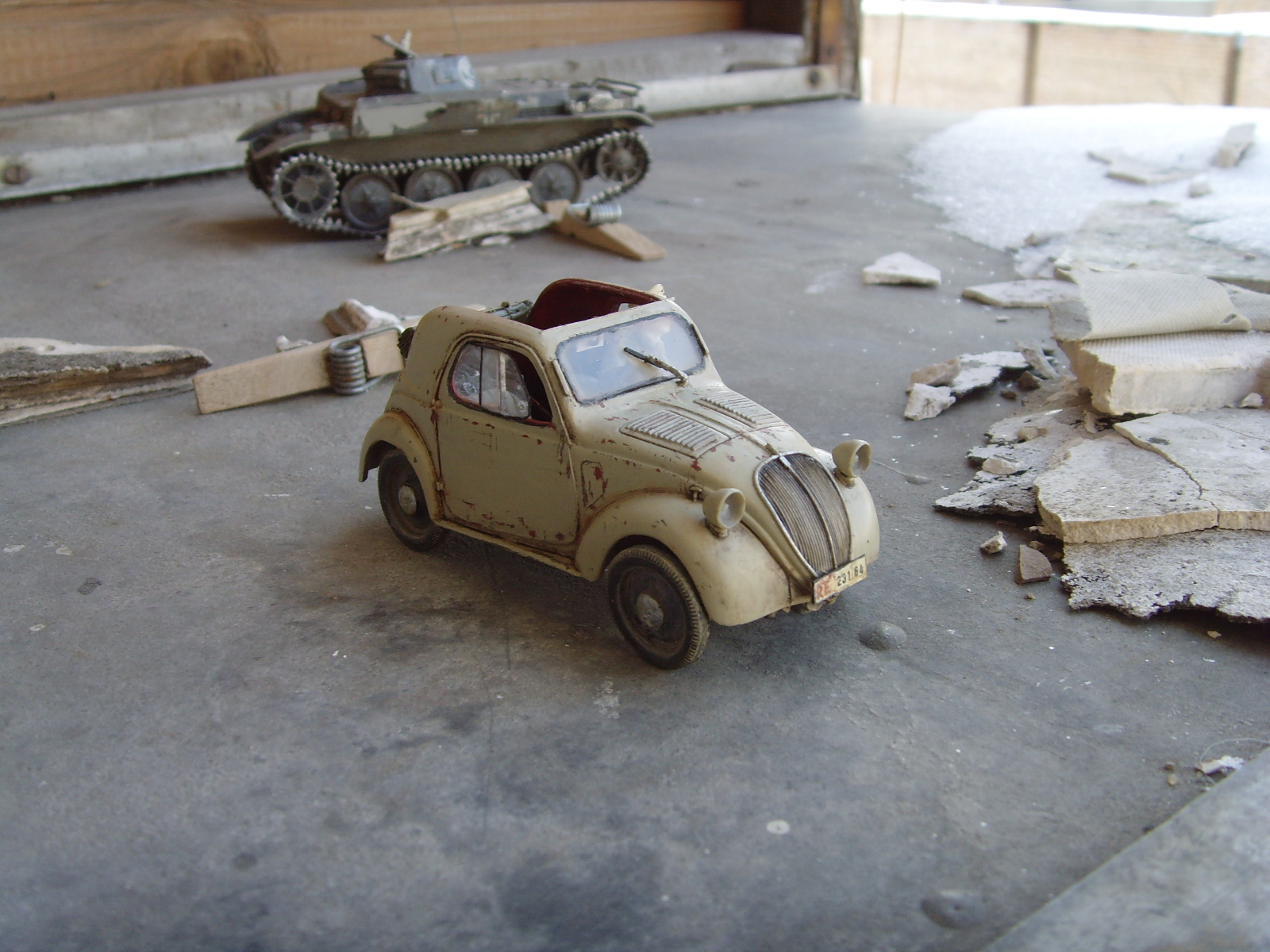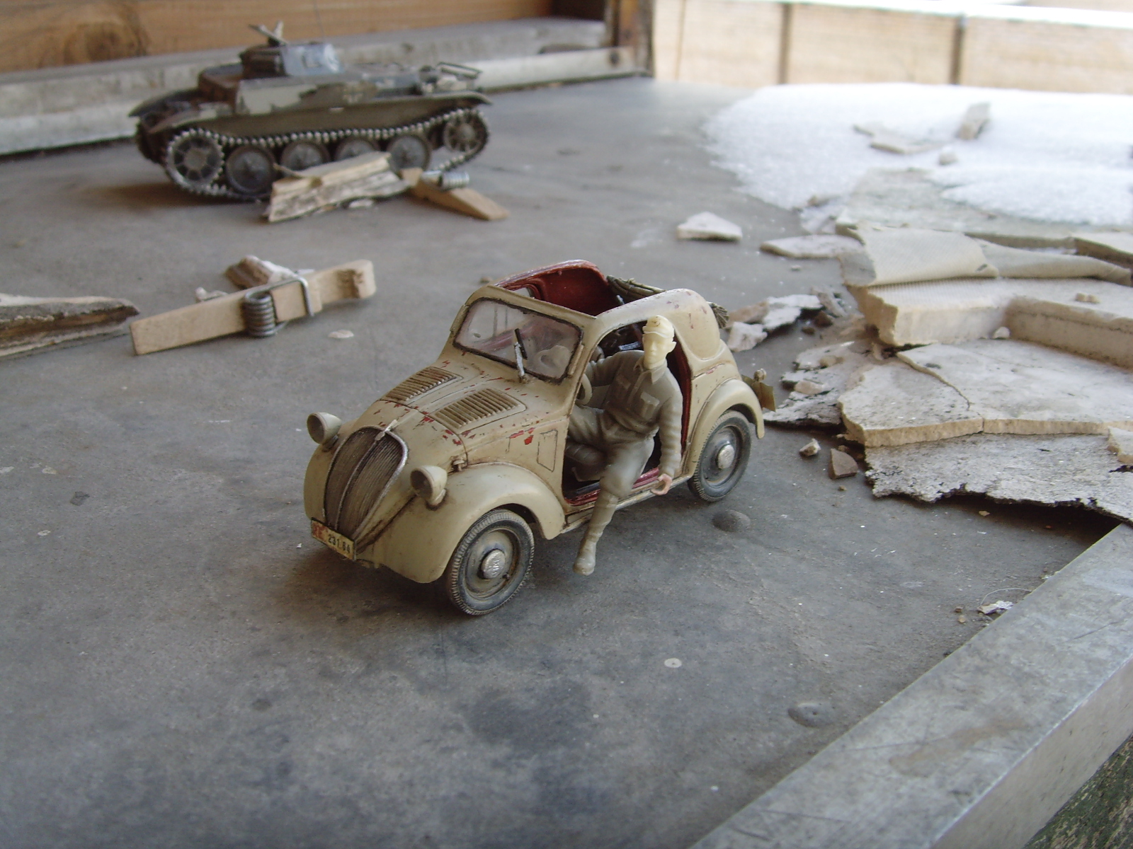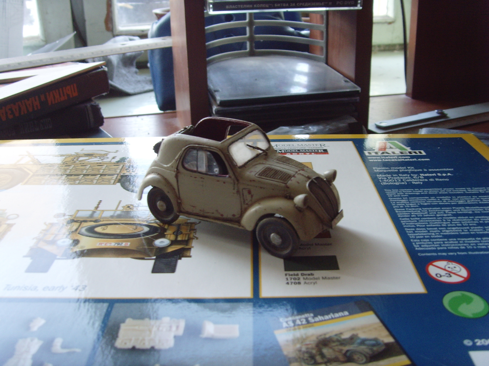 Вот итальянский "джип" FIAT 500 A - пиратка от Моделвиктории. Прикольный автомобильчик, использовавшийся доблестными итальянцами в качестве военного, похоже, от безисходности. Пиратская отливка не имела ни стёкол, ни декали, ни фотоэтчеда. Имелось много пузырей, из-за этого пришлось самому изготовить правый лонжерон рамы, пару поперечин, кардан. Также изготовлены дворник, стёкла, рычаги коробки и стояночного тормоза, номера, зеркало, козырьки..