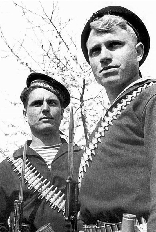 А бойцы на верхнем фото, вероятнее всего из отряда Куникова (с сентября 1943 на его базе сформирован 393-й батальон МП), по крайне мере на других фото этой серии известно конкретное имя баяниста, а он как раз Куниковец, погибнет в 44-м... с миной тральщик с морпехами не разойдется.