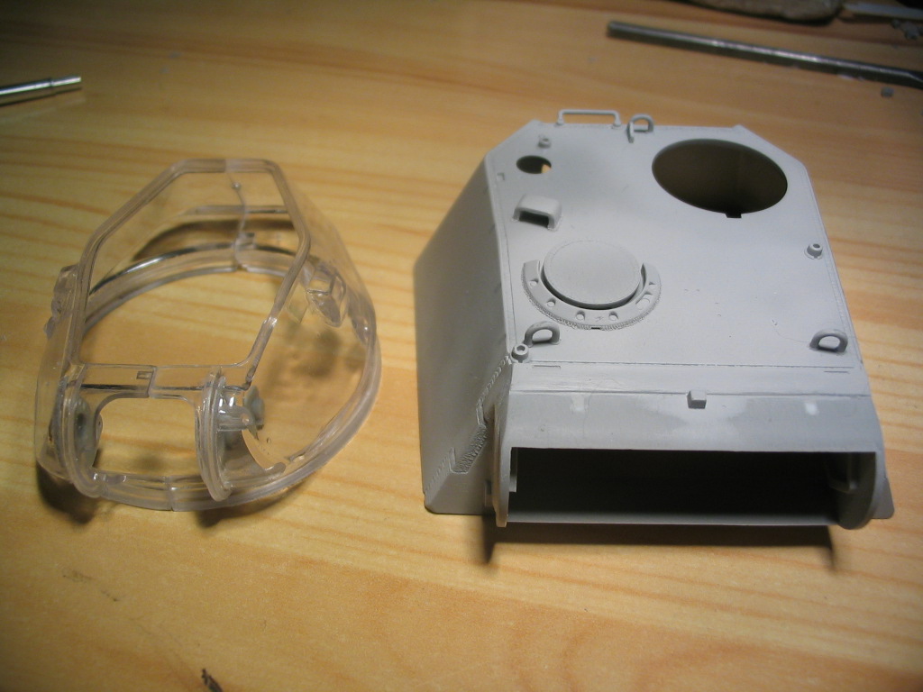 Вид на крышу башни. Ограждение зазора между маской и крышей башни пока не установлено. Раздумываю устанавливать ли кронштейны под датчик применения противником ОВ. Основание устроиства Orterkompas решил не устанавливать в принципе и на чертежа Jentza его нет.