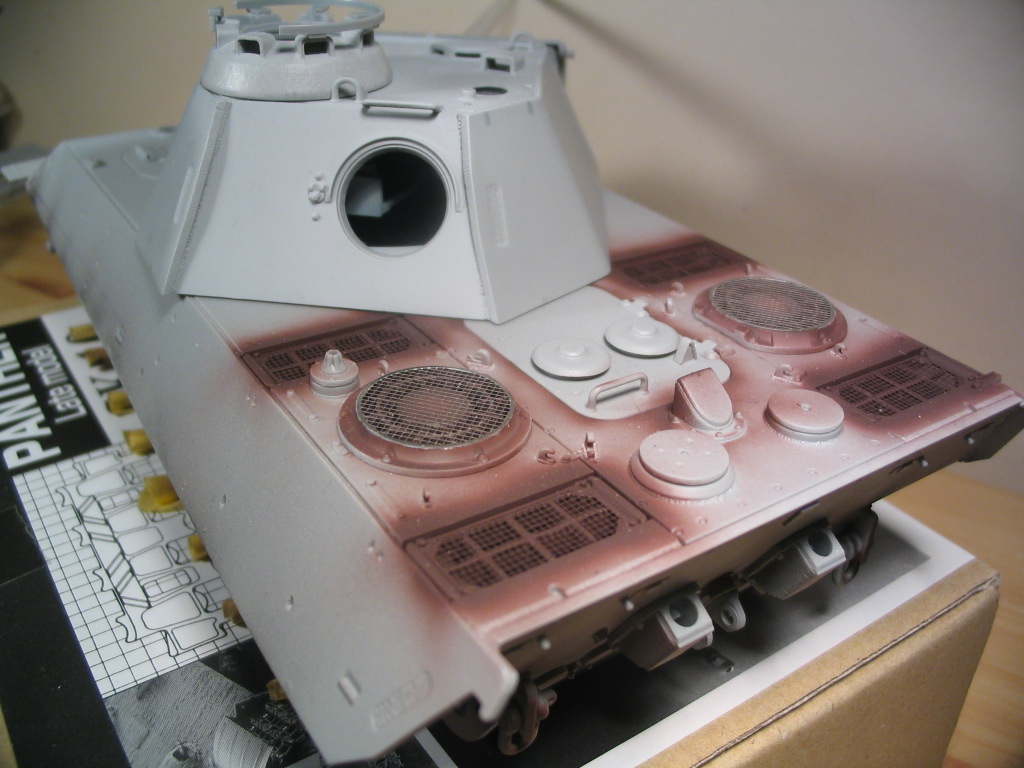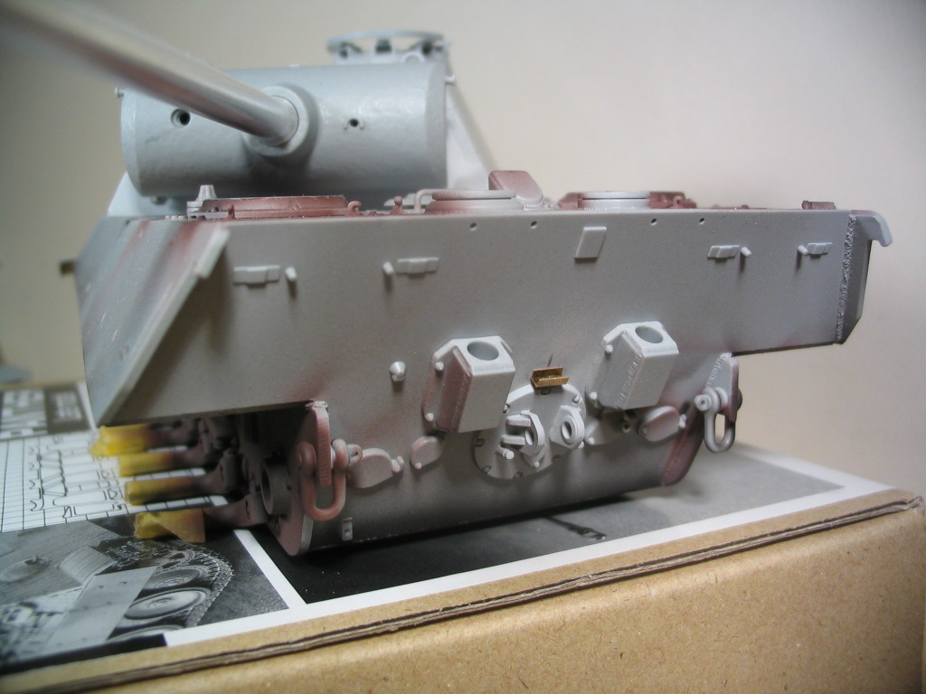 Поскольку на моей поздней Пантере уже стоят сварные бронировки вывода выхлопных труб, очень хотелось на этой модели поставить литые. Но анализ фотографий показал что на всех сфотографированных Пантерах этoй серии стоят сварные, так что скрепя сердце пришлось снова ставить сварные.