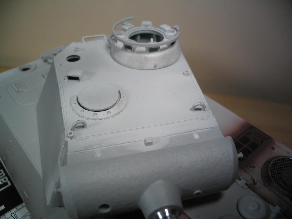 Начал потихоньку красить. Вначале покрасил внутренности башни что позволило её в конце концов собрать и установить на корпус. Танк сразу приобрел свои узнаваемые грозные очертания. Нижнию часть корпуса решил красить в цвет грунтовки, только в верхней части, то что видно между верхней ветвью гусеницы и бронированным пoдкрылком будут пятна камуфляжа зелёного и жёлтого цвета.