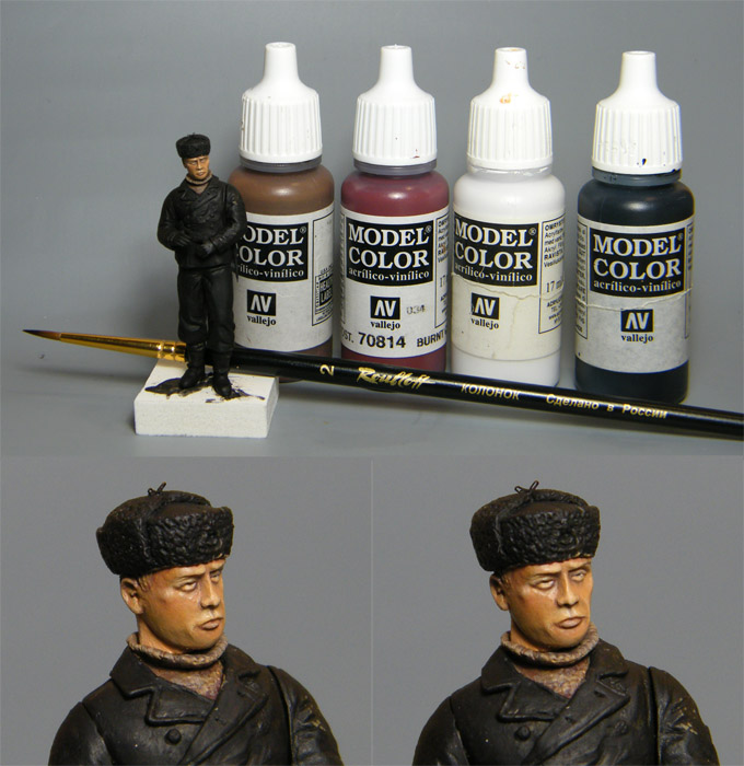 Дмитрий Шишков, При росписи фигурок обычно пользуемся системой: кладем базу, а оттенки для теней делаем постепенно из базы с добавлением более темной краски, база добавляется каждый раз являясь, своеобразным связующим звеном между основным цветом лица и тенями, так же поступаем и с выступающими гранями постепенно выводя базу до разумного предела более светлой краской. Такое ощущение что в какой-то момент работы базовый цвет как связующее звено не применялся при смешивании краски для теней или высветлений. Но если над лицом фигурки еще будет проводиться работа, то возможно я просто придрался к незаконченному варианту.