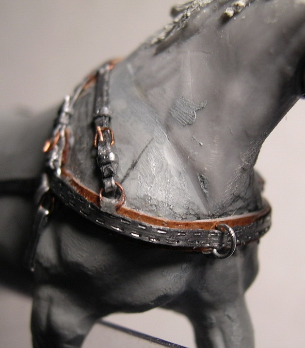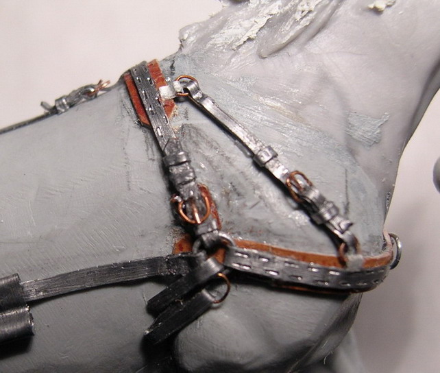 К вшитым в нагрудный ремень шорки кольцам крепились нашильники (ремни соединяющие коренников с дышлом). Оголовие трензельное, состоит из удил, переносья. суголовного ремня. налобника, щёчного ремня и подбородочного. Вожжи пока не показаны.