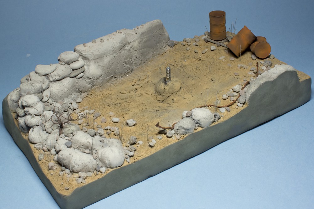 Ну и вся подставка перед нанесением лака. Докрасил кистью все поддувания от аэрографа, придал разнообразие оттенков камням. Покрасил кустик, трос, поддон.