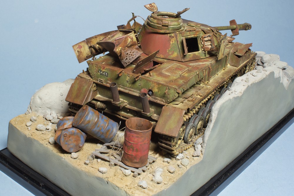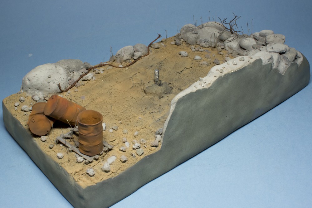 Мне тоже нравится. Я так понимаю - сверху будет стоять старая ржавая бочка. Можно добавить немного осыпавшейся ржавчины на песке и на поддоне(сухой и рыхлой ).