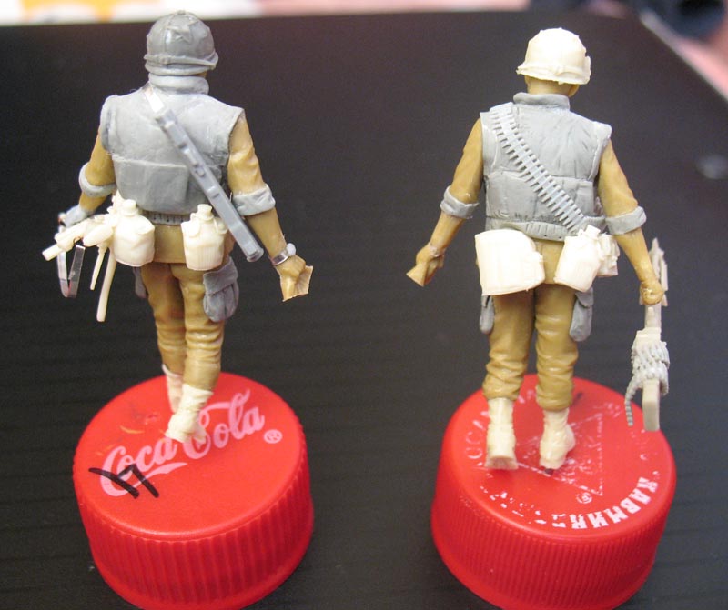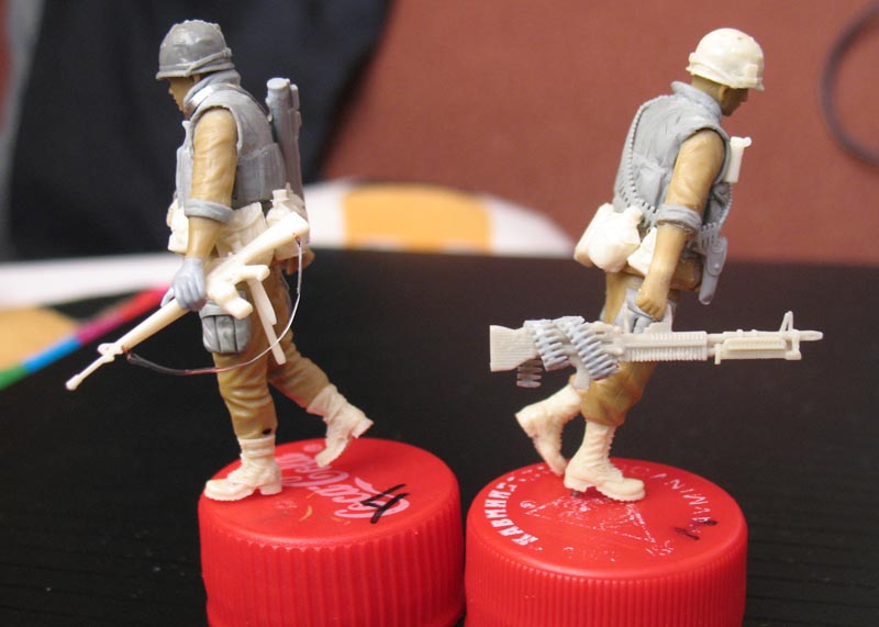 Ботинки взял из набора аксессуаров 5.45 "Амуниция Вьетнам №3" Соответственно, где-то подрезал. Кстати есть и более бюджетная версия - взять ботинки у амеров из набора ICM, но там протектор подошвы другой и пластик все-таки, а так очень похожи и их там 4 пары. Бронежилеты из "Эпоксилина". Сначала с фигур все соскоблил ножиком, а потом лепил. Получилось не ахти, но меня результат устроил - все-таки первый опыт лепки. Оружие,амуниция, каски - 5.45, Драгон, ТАНК.