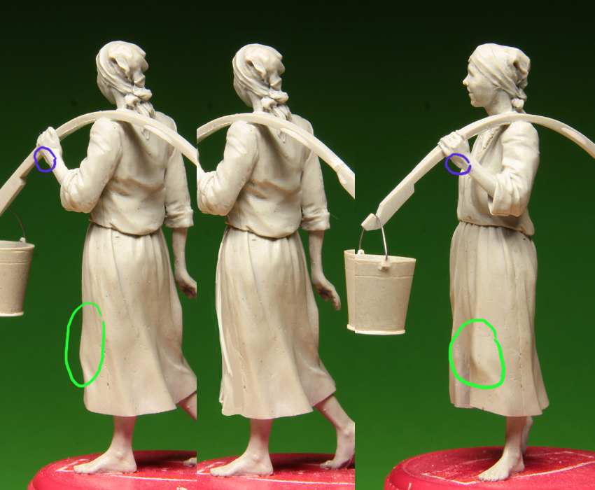Кроме того смущают два момента: 1)форма кисти в месте, обведенном синим(обычно такая "приплюснутость" появляется, когда ладонь опирается на плоскость, в данном же случае коромысло несколько выше и эта часть ладони его не касается), и 2) складка, как бы повторяющая по форме колено, но колено то уже в другом месте(выделил зеленым). Я думаю, нужно смягчить ее форму. В остальном отличная фигурка и думаю будет очень востребована!