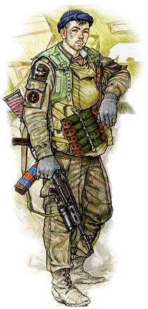 V_V, хорошая конверсия, но с левым плечом неладно. Нужно или плечевой сустав (стык руки с торсом) поднять или локоть (т.е. всю руку ниже опустить. Сейчас уж очень явное нарушение анатомии - режет глаз. Ещё уж очень податливо ремень гранатомета на груди складки, карманы и ворот огибают - нет ощущения натяга ремня создаваемого тяжелым гранатометом. А в остальном замечательно!