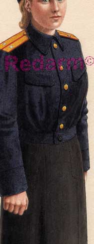 Женщины офицеры носили синий китель, интересный момент, на некоторых фото у девушек на беретах офицерские эмблемы, а на рукавах нет никаких знаков различия, при этом подписи просто гласят "медсестры". Так как, эти фотографии сделаны на СФ в 1942 году, можно было бы предположить о частной инициативе выдачи более теплого, с закрытым горлом элемента формы. Но офицерские крабы и фотографии с танцующими в фланках девушках дают основание считать их скорее воен-врачами. Может быть они вольноопределяющиеся и поэтому им не положены знаки различия? Ответа на этот вопрос я найти не могу. Кроме того, некоторые офицеры носили фуражку.
