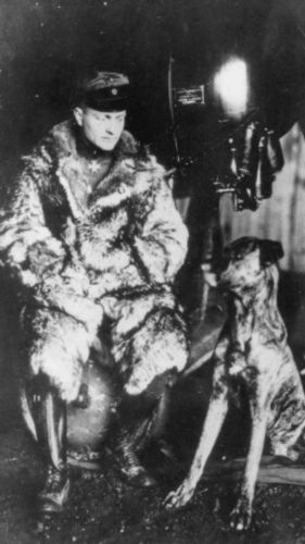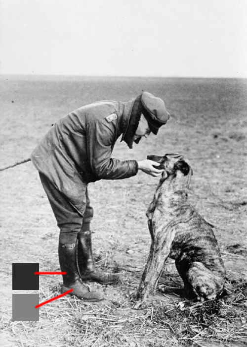 В пользу моей версии о коричневых ботинках и чёрных гамашах (пардон, я не знаю как верно назвать этот аксесуар, если знаете- подскажите) говорит вот это хорошо сохранившееся фото лётчика с догом Морицем. Посмотрите на разность чёрного цвета.