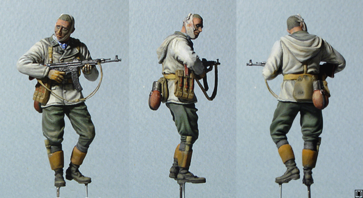 А мне имитация кожанки в исполнении Андрея Климанова понравилась больше, чем у "альпиновского" художника. Хотя мне в жизни так и близко не научиться расписывать - но воля ваша, у фигурок "альпайна" куртки либо из флиса либо из одеяла сшиты, такое впечатление (а вот основание - просто отвал башки. Настоящая осень!). А у комиссара видно сразу - потертый кожан!