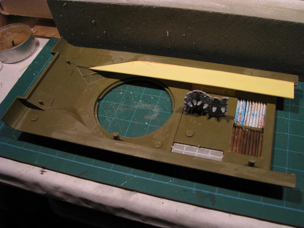 Посчитав попытку неуместной, (много огрехов при рассверливании и небольшое отличие от простых наборных склеенных плюс непозволительно много времени на процесс), приступил к обычной сборке гусеничных лент на клею. Доработки верхней части корпуса состояли в добавлении надгусеничных полок, забытых производителем, материалом для них послужил листовой полистирол толщиной 1 мм, как нельзя лучше подходящий для этой цели. Для поддержки полок в соответствующие места были вклеены отрезки литников.
