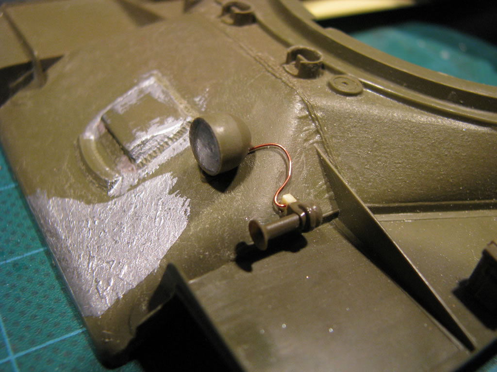 Найденные утяжины, были залиты эпоксидной шпаклёвкой, и впоследствии были зачищены буром, зажатым в патрон минидрели, в некоторых местах броне был придан более шероховатый вид. Сымитированы сварные швы буксирных рымов, кромки выхлопных патрубков доведены до масштабной толщины, ограждения сточены до соответствия масштабу. В одном из ящиков ЗИП имитированы пулевая пробоина и вмятина, одно из крыльев частично срезано, второе доведено до масштабной толщины, «продырявлено» осколком и погнуто. Фара из набора доработана – корпус рассверлен, добавлен отражатель, следующим этапом залит двухкомпонентный прозрачный эпоксидный клей и наконец сверху положен рассеиватель из прозрачного пластика выпуклой формы от пищевой упаковки, с нанесённым резаком рисунком. Раструб сигнала также доработан путём рассверливания, в завершение работы над фарно-сигнальным узлом проводка имитирована проволокой.