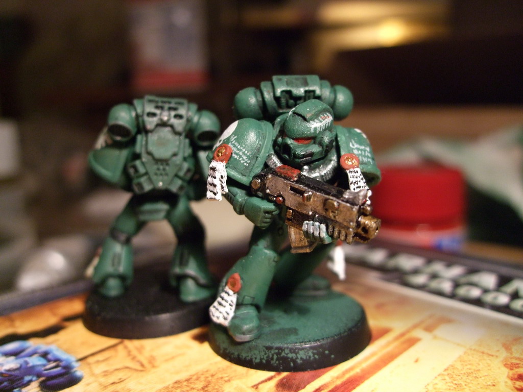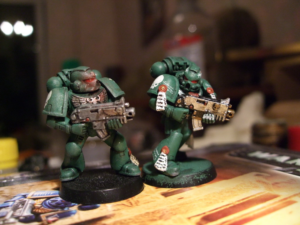 твоим маринам не хватает высветление, я бы посоветоам сухой кистью по ним пройтись: смешай свой зелёный и немного белого, потом акуни туда кисть и оботри её о салфетку так, чтобы краски на ней осталось совсем чуть чуть И вот этой самой кистью пройдись по выступающим частям доспехов, стараясь как бы снова закрасить их. Ещё конечно смывки не хватает, но эт уже не ко мне.