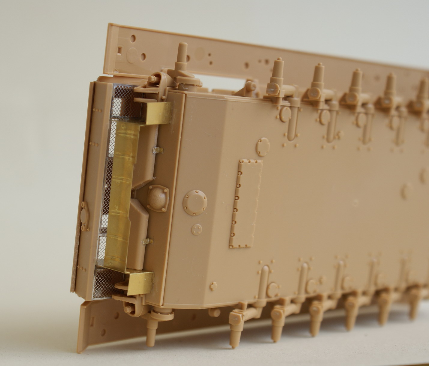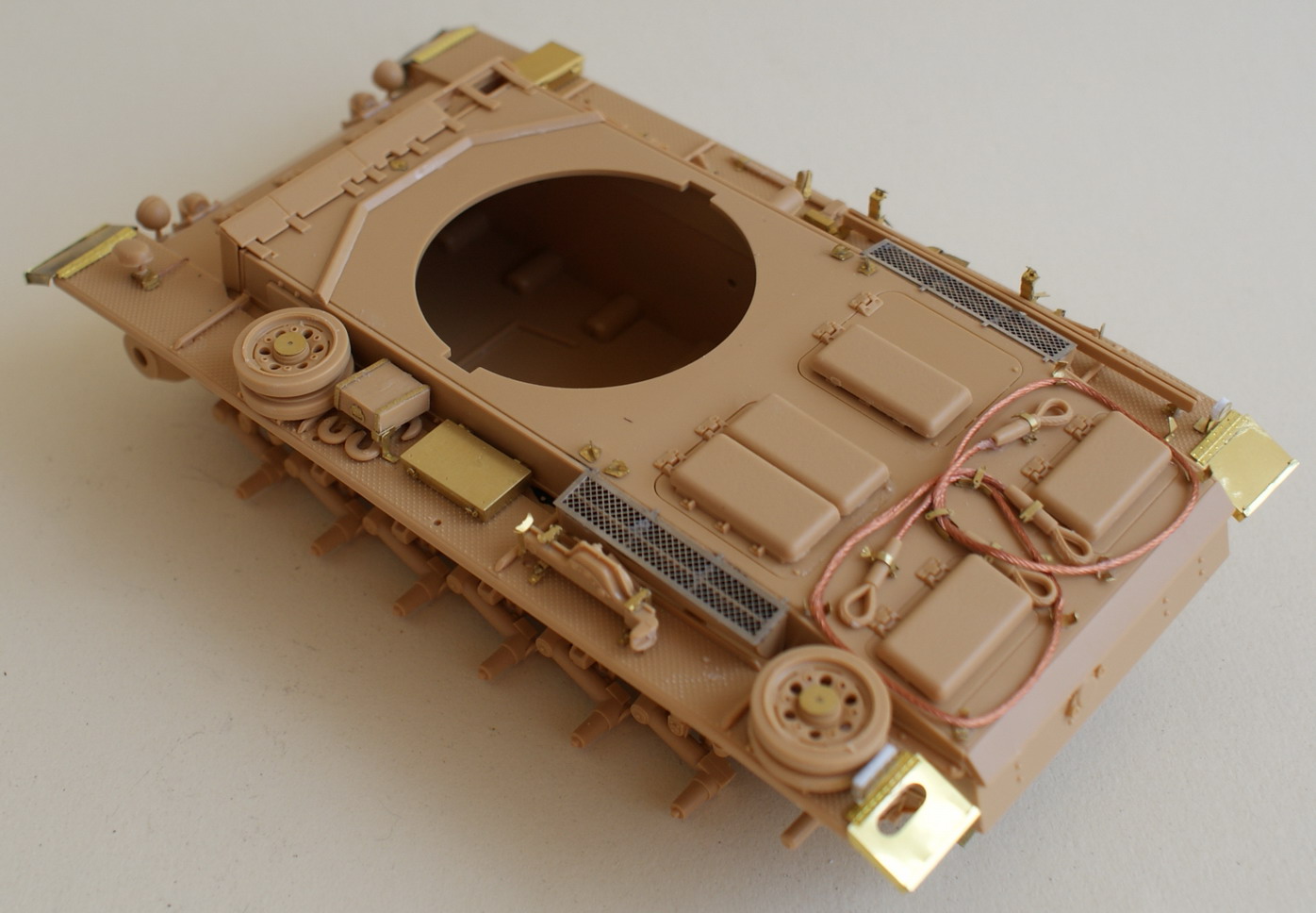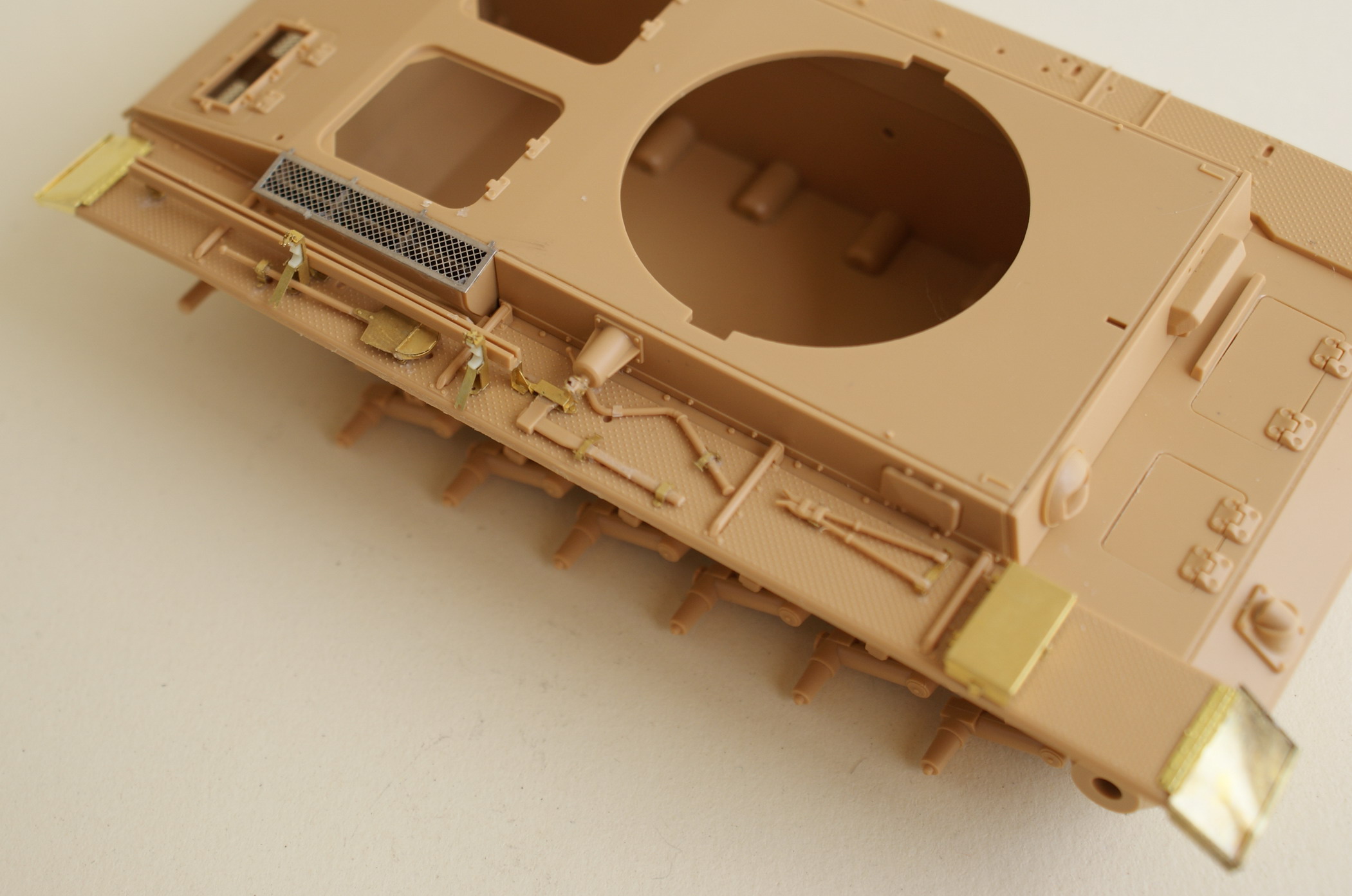 Начал работу. Собрал ходовую и склеил части корпуса чтобы было от чего отталкиваться. Корму "облагородил" травленкой, тут столкнулся с особенностями китайского производства – Вояджер предлагает два варианта сборки кормы с комовыми дымовыми шашками и без. В первом варианте решетка состоит только из боковых секций, так эти секции значительно меньше посадочных мест. Я использовал сетку из травления идущего в наборе. Пока не стал клеить цепочки к пальцам буксировочных петель.