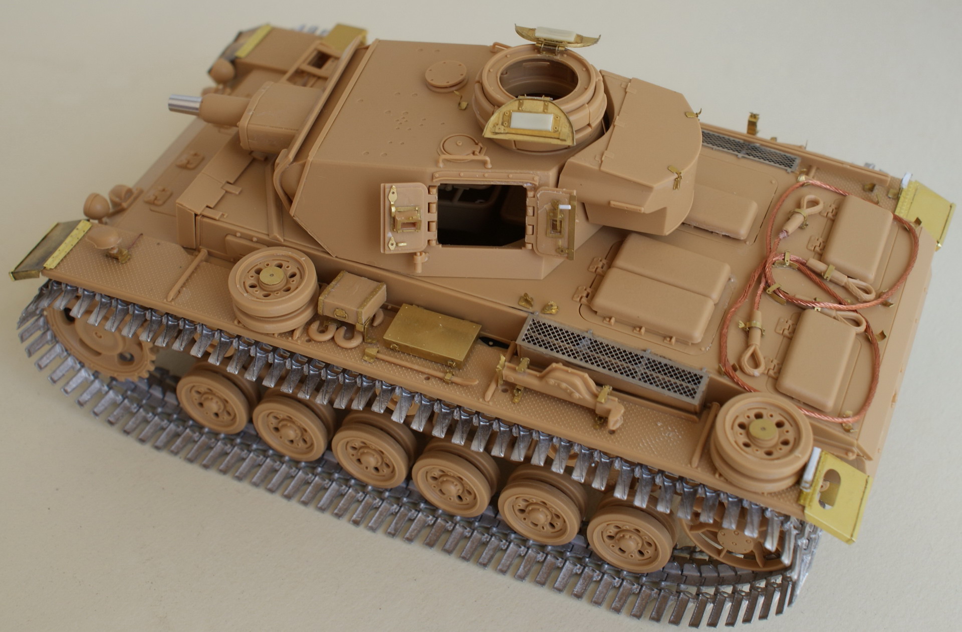 Немного означу фронт работ. Основной работой по технике будет доработка ее фототравлением. Первоначально для модели взял вояджеровский набор (PE35158) – в наличии куча мелочей (крепления, крюки и прочее), точенные патроны дымовой защиты, металлический трос и смоляные петли к нему, но нет травленных крыльев, которые есть на рекламных фото этого набора. Только потом на коробке мелким шрифтом прочитал, что это отдельный набор. В общем не густо. Еще в запасниках у меня лежит старый набор того же Вояжера (PE35005) на драгоновскую тройку М/Н. Из него планирую взять передние/задние крылья и дополнительное бронирование на лобовой лист.