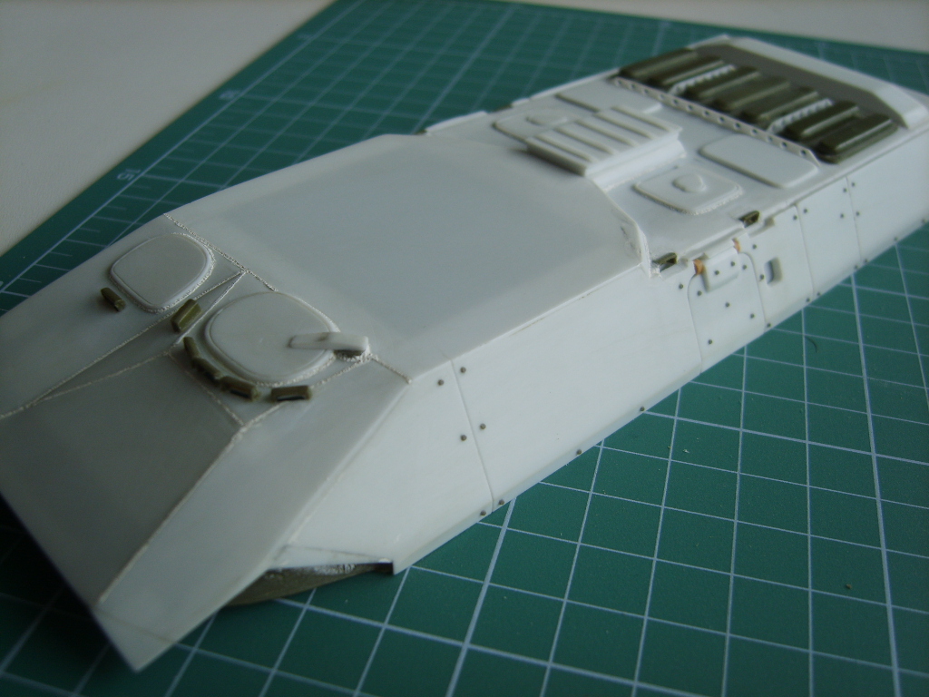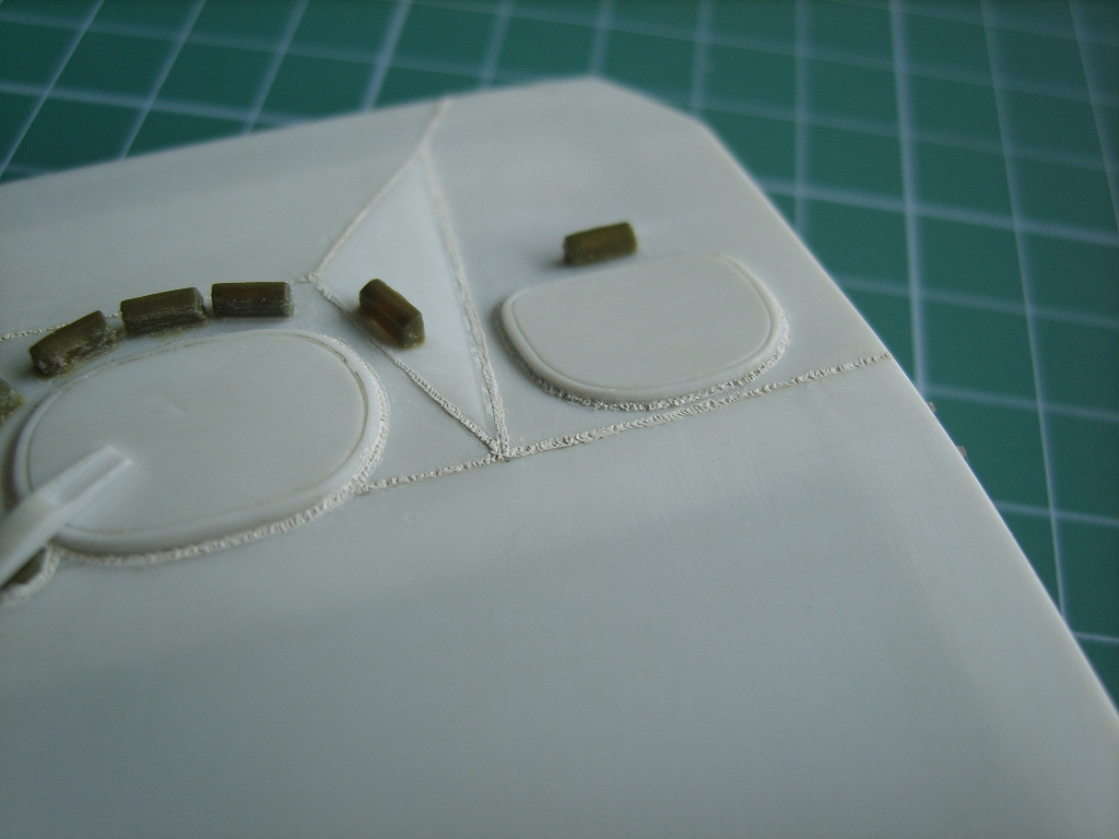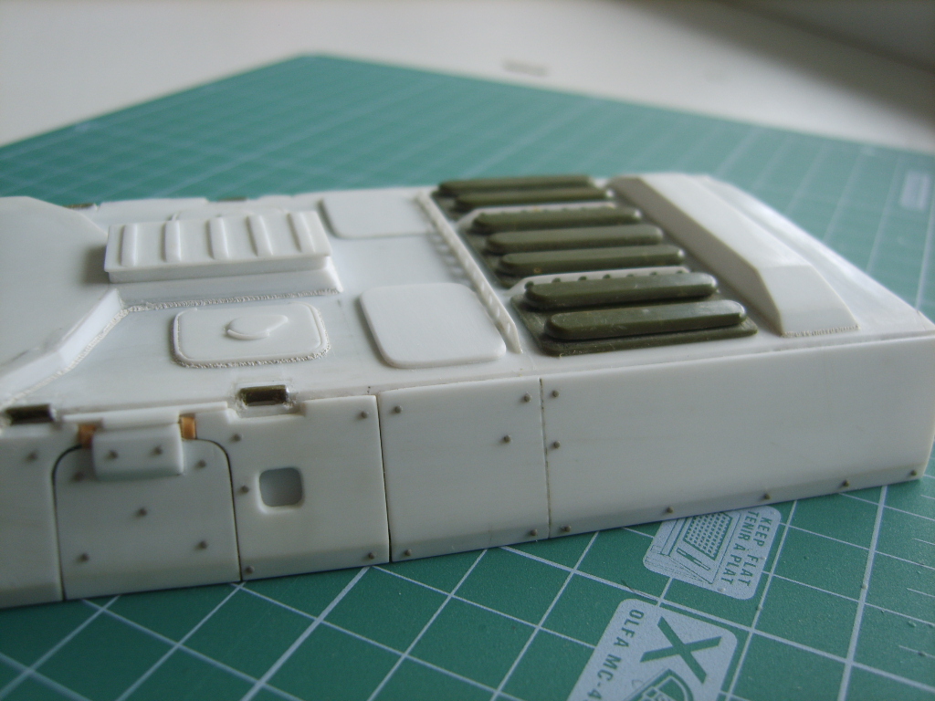 Из пластика самостоятельно делаю люки. Пытаюсь воспроизвести сварные швы из тамиевской шпатлевки, болты на шайбе мастерклабовские. Вообще данный проект в отличии от предыдущих