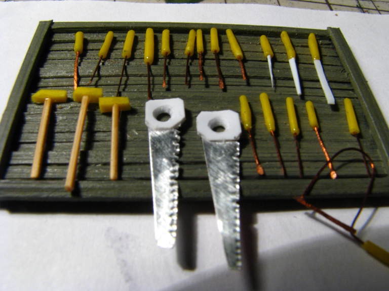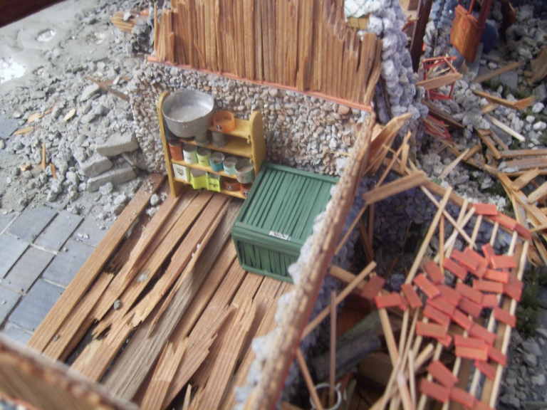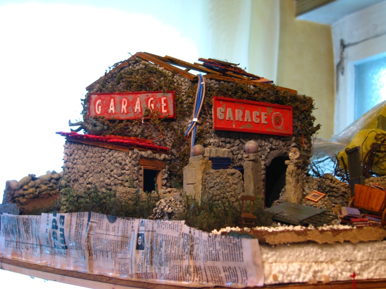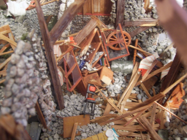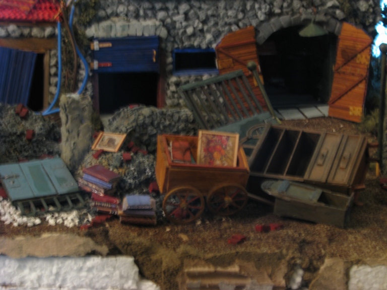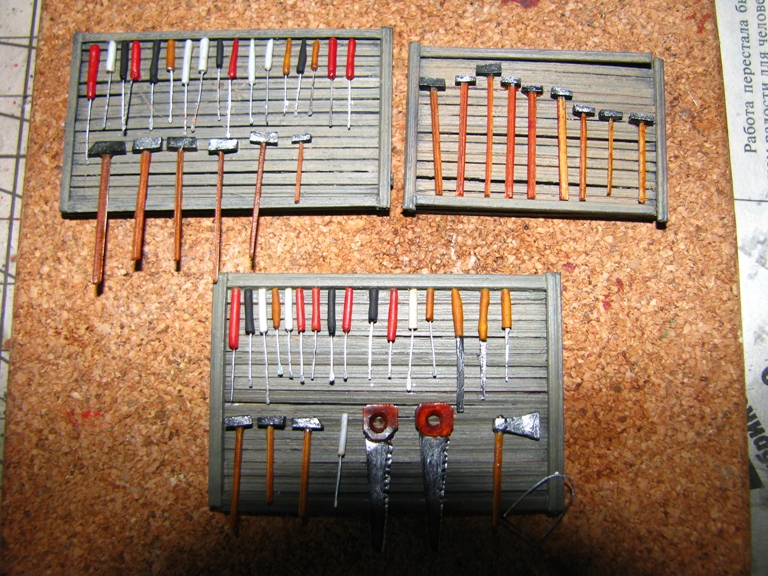 Все строения самодельные. Инструменты изготовлены из проволоки и пластики. Мебель, тележки и прочий скарб также самодельные.