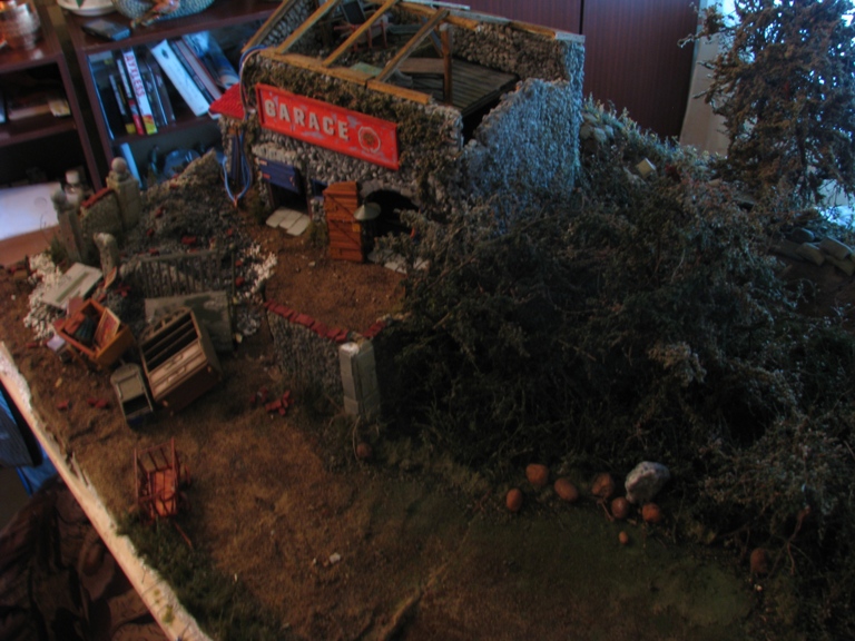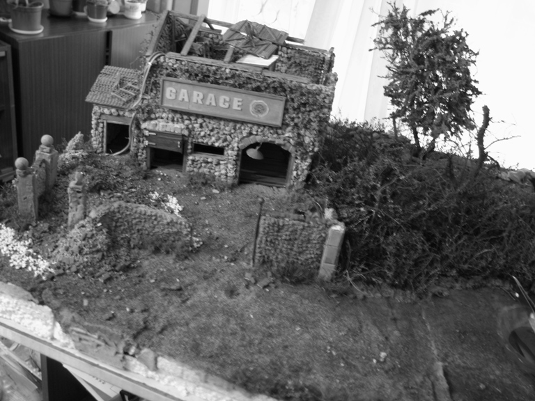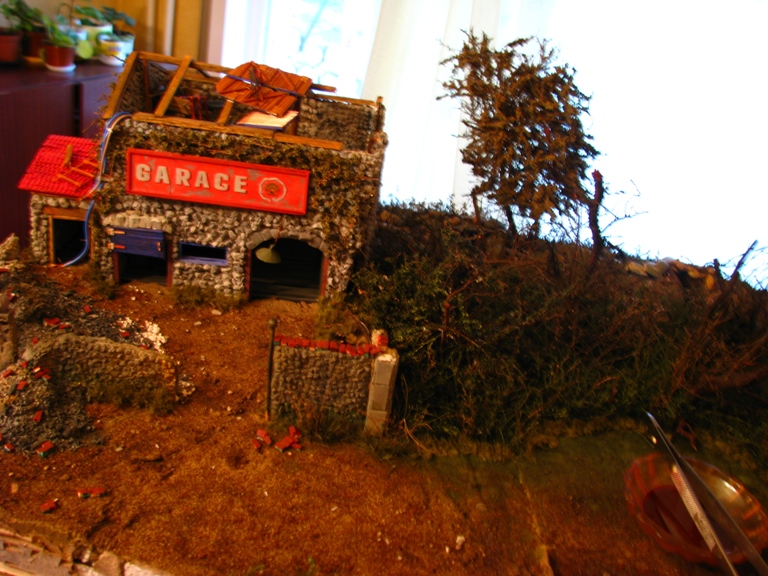 План диорамы. Я разделил ее на три блока. ДОМ САДОВНИКА. ДОРОГА. ГАРАЖ. По замыслу гараж немцы используют как и по прямому назначению – ремонт мотоциклов, так и для пункта наблюдения. В гараже есть шкафы. Ящики с инструментами . освещение. На чердаке есть ящики, мешки, шкафы.