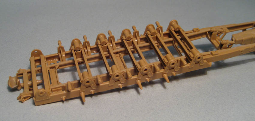 На днях было немного свободного времени и я успел повозиться с рамой. Честно говоря уже давно не клеил ничего звездовского. Первые впечатления от лиников были исключительно положительными. Но вот начав работать с моделью, оптимизм несколько улетучился. Во-первых на всех деталях весьма заметный шов от стыка пресс-форм. Раза в 2-3 больше, чем у Драгона или Тамии. Ну да ладно. Это легко счищается. Большее опасение вызвало, то что один из литников сильно поведен. Т.е. кузов и рама идут изначально косыми.