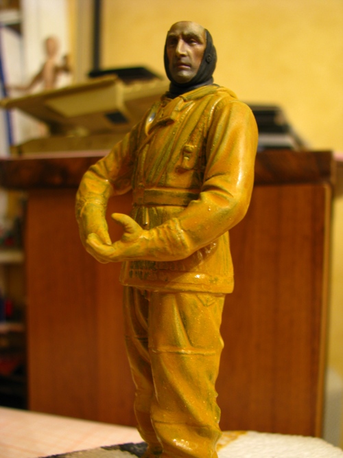 поверх ярко-желтого базового слоя нанесен полупрозрачный слой темперной сиены натуральной. далее смешал колор на основе масляных красок и оттонировал униформу и подшлемник.