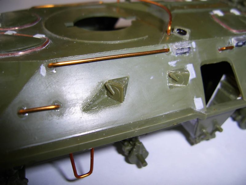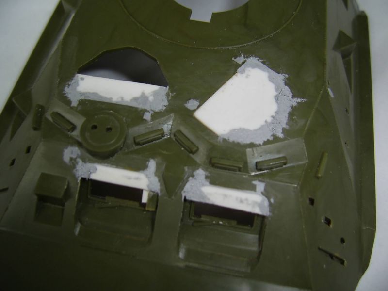 Корпус, похоже, таки короче в передней части. Должен быть сварной шов перед пулеотбойником. Его нет. И петли люков, по большому счету, будут упираться в башню. Верхние крышки люков все-таки пришлось сточить. Получается уже не копийно, но деваться некуда. Сами крышки люков стали меньше. Пришлось заделать отверстия под верхние и передние крышки люков. Передние крышки будут чуть опушены вниз, а то петли тоже не поместятся. Перископы на ботрах срезал. Они должны быть немного ниже. Сами обзерочки не выбрасваем: их потом наклеем и на них потом будем лепить жесть. Верхние перископы на крыше десантного отделения тоже будем выбирать изнутри.