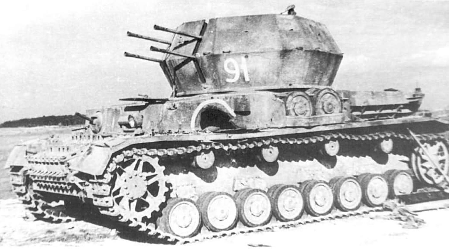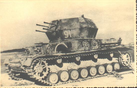 В 1944г. Flak/E4 смогли показать первые разработки. Орудие Flakvierling 38 (счетверенная зенитка 20мм) установили сверху на шасси Panzer IV, орудие и расчет защищали 4 откидных бронелиста 2х12мм. Во время производства, начиная с 46й машины (в некоторых изданиях говорится, что всего лишь прототип был вооружен пушкой Flakvierling 38 ), Flakvierling 38 заменили на 37мм Flak 43, а толщину откидных бронелистов довели до 25мм. В боевом положении бронелисты откидывались для обеспечения кругового огня орудия. Недостаток данной машины заключался в том, что на откидывание бронелистов уходило некоторое время даже у экипажа из 5 человек, кроме того в боевом положении (с откинутыми бронелистами) экипаж орудия защищал только бронещит самого орудия, так же из-за размещения орудия сверху почти стандартного шасси Panzer IV у машины была значительная высота. За характерную внешность машина получила прозвище «Мебельный фургон» (Mobelwagen). Всего было построено 240 машин этого типа компанией Deutche Eisenwerke AG на шасси Panzer IV поставленных фирмой Krupp-Gruson.