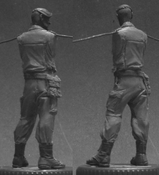 - немного не угадал с позой. Если бы ты отклонил немного грудную клетку назад, а голову наклонил бы вперед (как на реальном фото бойца), то поза при виде в профиль стала бы много естественее.