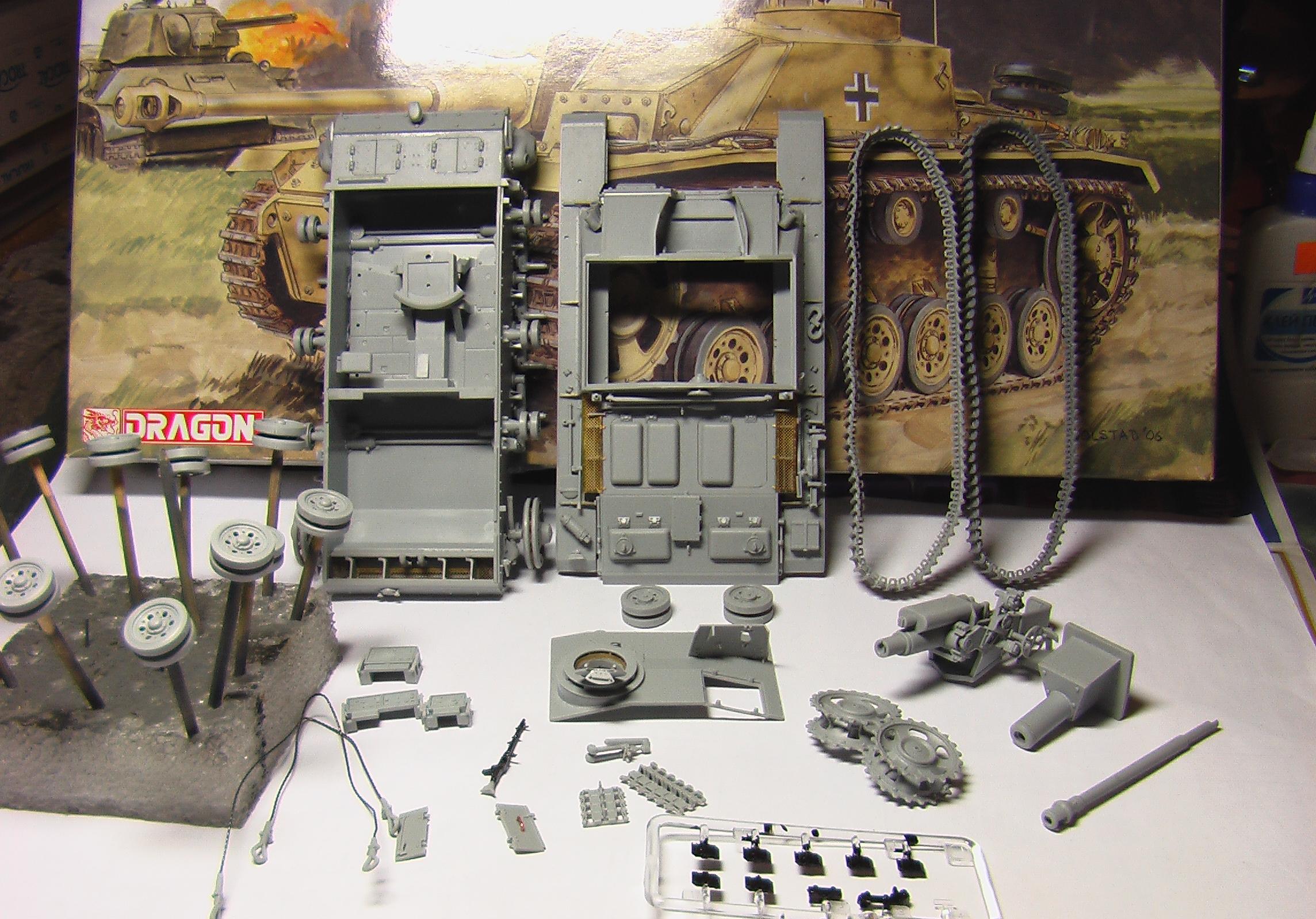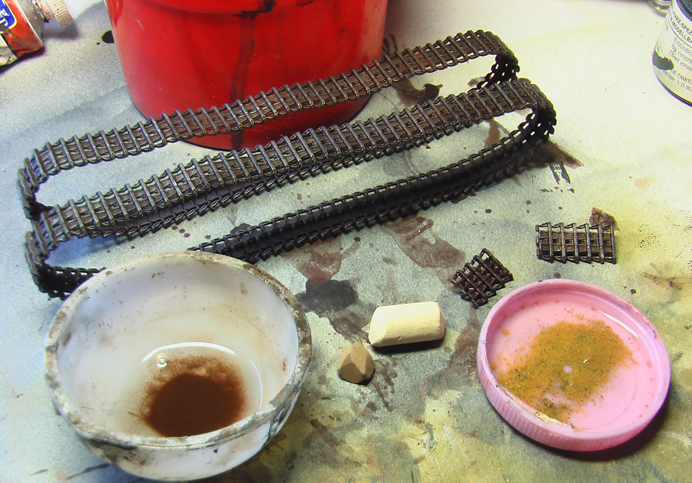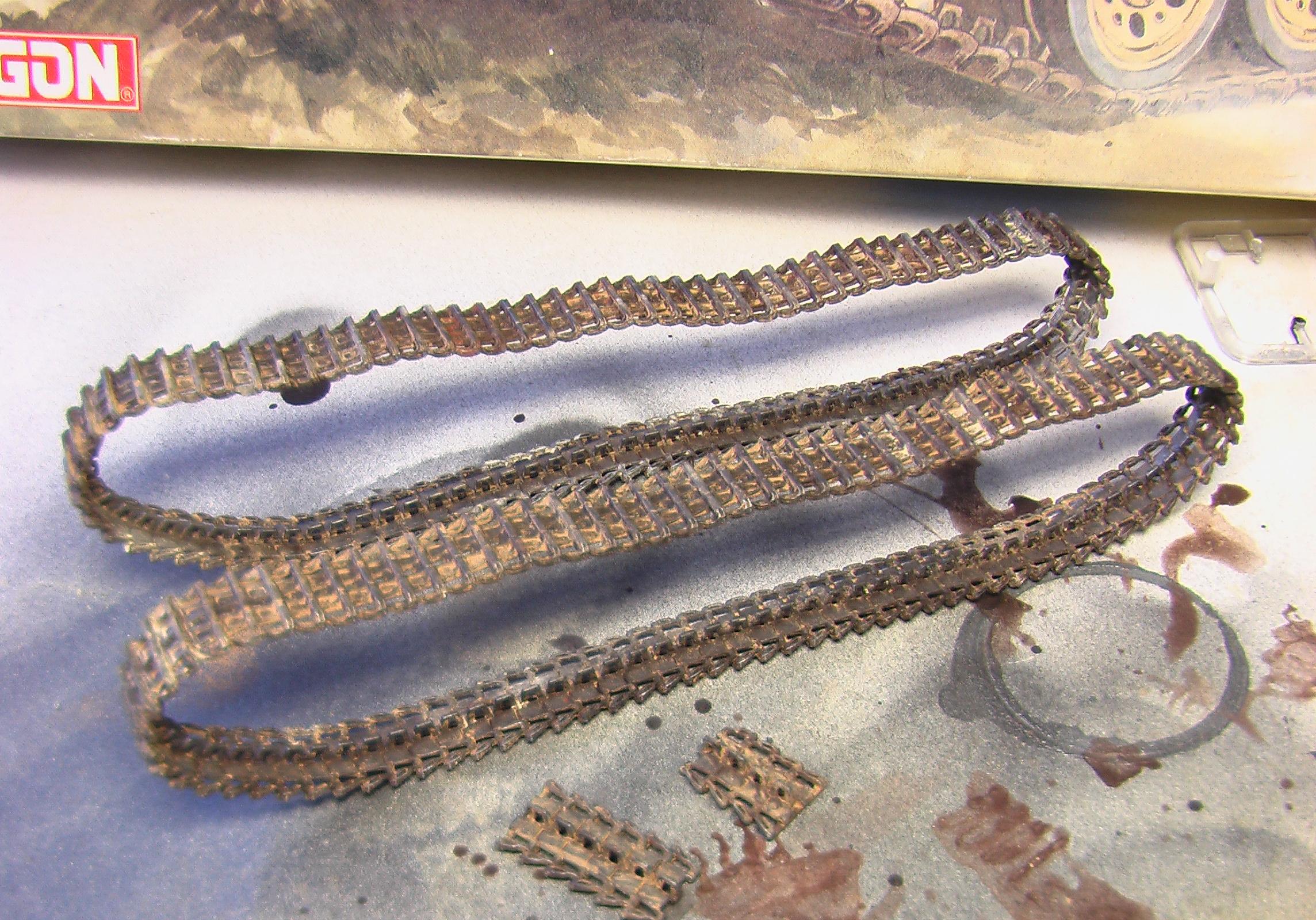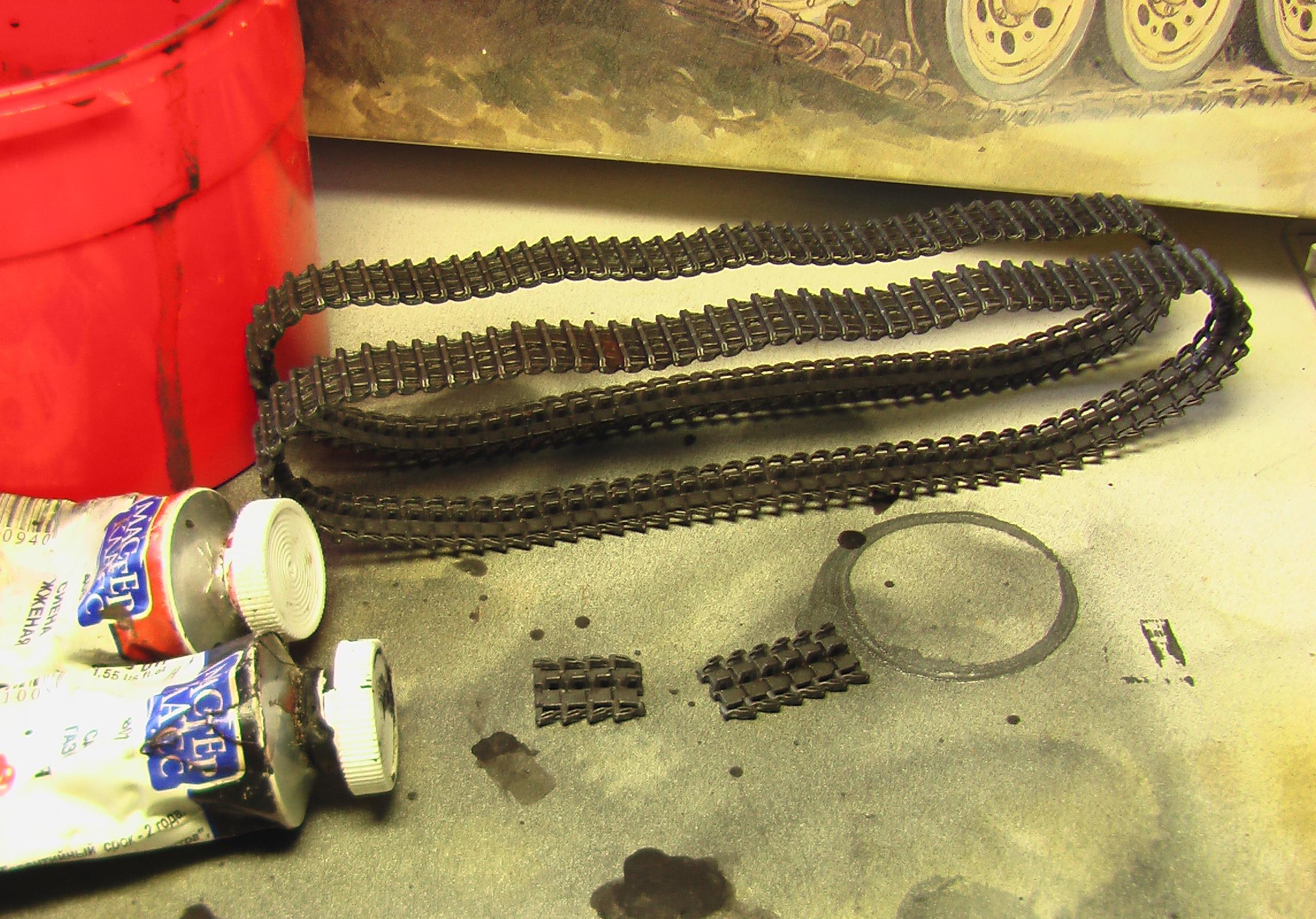 Честно говря даже представить себе не могу как это возможно.Гусянку собирал всей лентой сразу.В инструкции указано количество траков,которое понадобиться.НО!Не всегда это правда.Тут нужно смотреть по ходу работы.Кладем на столе трак гребнем вверх.Капаем мааааленькую каплю клея в углубления под следующий трак(тут я использую только клей с иглой "faller"у него игла тоньше,чем у Ревела,но это не принципиально.Можно и Звездовский кисточкой наносить.Но ели клея будет мало,то потом все развалится.)и так один за другим,пока не соберу всю ленту.Занимает минут 20-30.Собираю обе сразу.Катки и звездочки на сухую ставим на место.Но садиться должны плотно.Не падая.Не всегда получается так,тогда можно на каплю ПВА посадить.Ну и как только закончил вторую ленту,первую можно накидывать на катки.Огибаем звездочку,поддерживающие катки.Делаем провисы.Лента мягкая и великолепно гнется.Соединяю ленту по низу,обычно.Так удобнее.Накидываю вторую и оставляю на следующий день.Все снимаю и крашу по отдельности.Никаких проблем.Не на всех моделях можно так сделать.Иногда приходится делать ленту из двух половин.Передней и задней.Так и красить.Потом уже при сборке она будет стыковаться сверху и снизу.