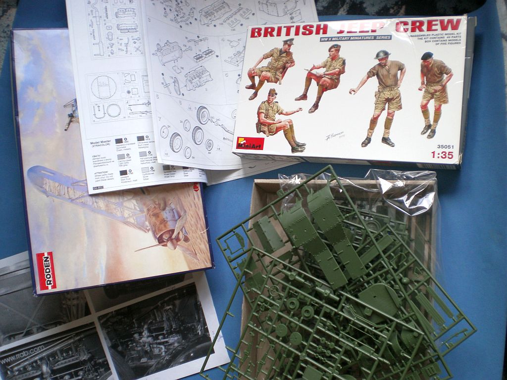 Я не скульптор, мне пришлось конверсировать Миниарт. Их набор с экипажем джипа очень хорош - четкое литье, складочки, живые позы, отличная мелочевка. Но - мне нужны были иные персонажи, скажем, шотландец-коммандос (набор-то сделан по фото Бантама герцога Глостера) с заднего сиденья мне был не нужен. Потому началась "переборка и подгонка" рук-ног-голов. Хотелось сделать одного из РАФ в популярной серо-голубой летчицкой фуражке. После некоторой переделки ему отлично подошла голова от эсэсовского танкиста Миниарта - фуражки формой очень похожи, а "эмблему и ремешок и подделать можно".