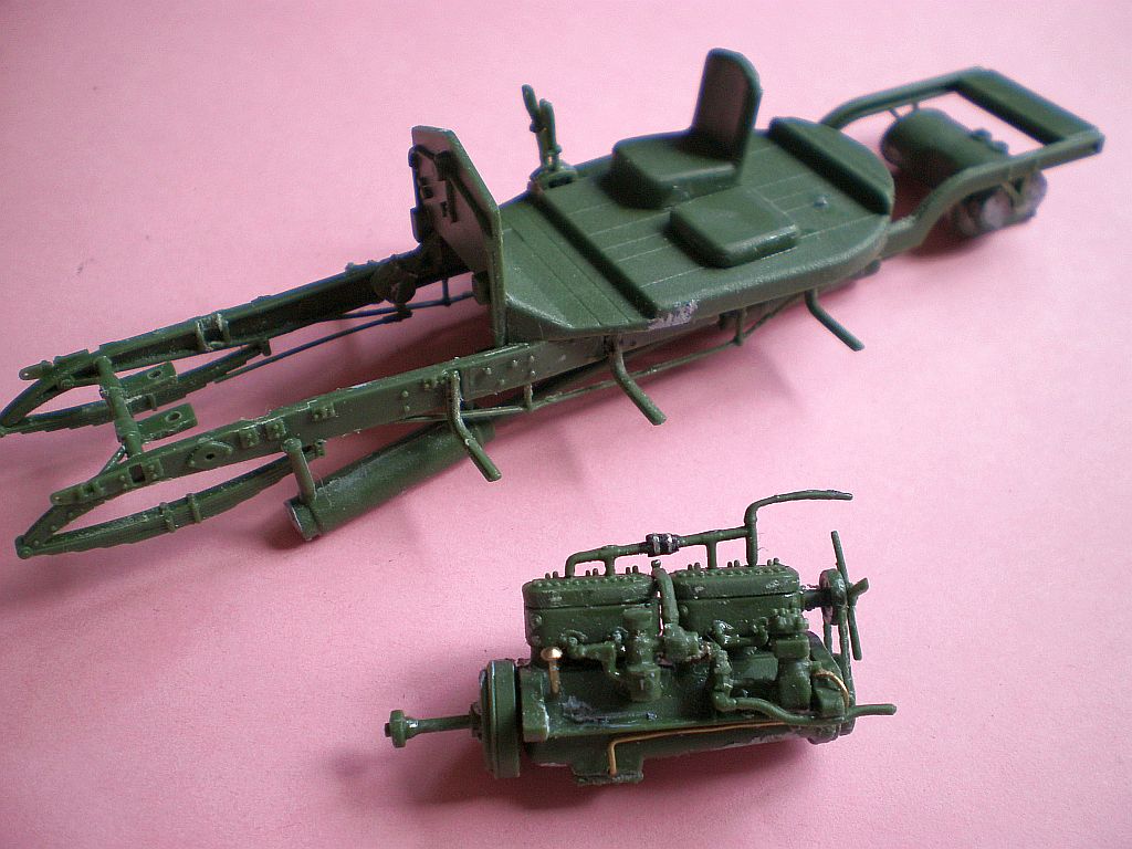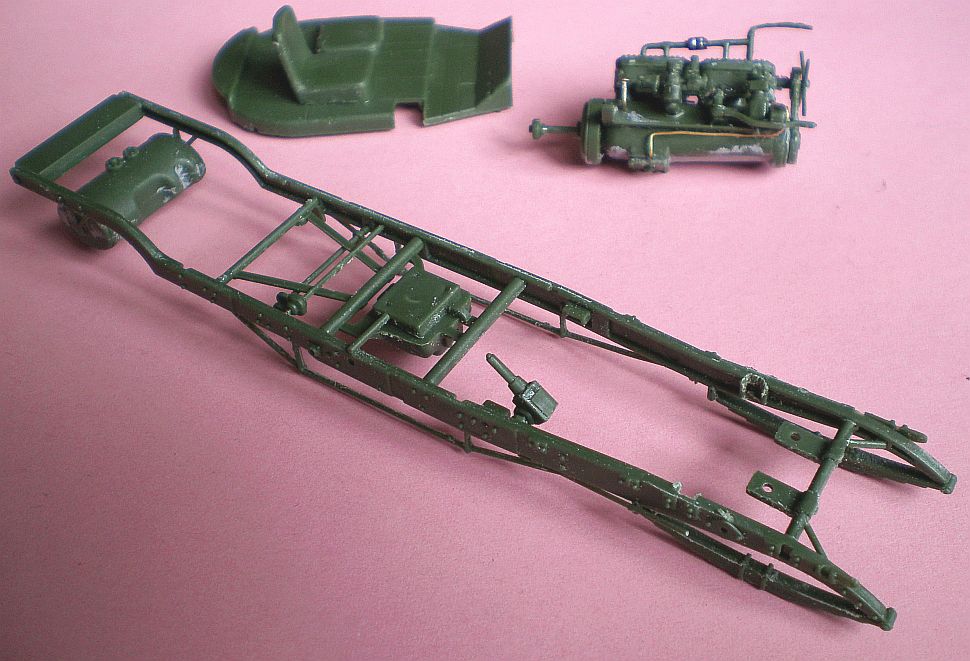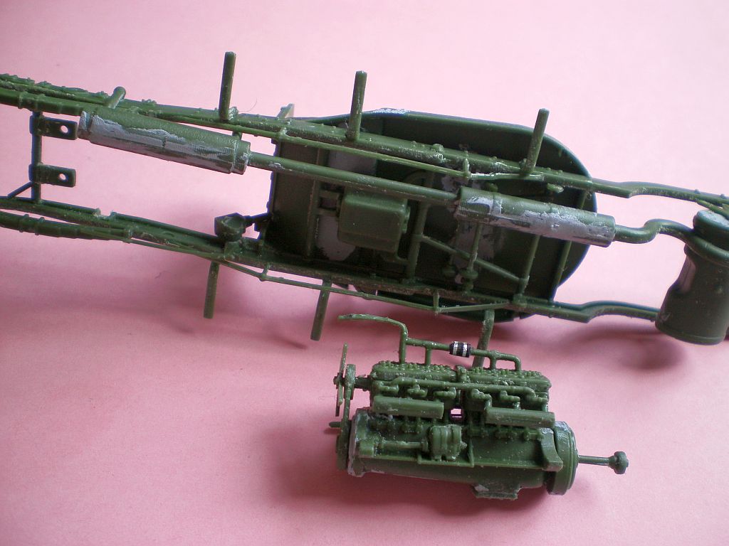 Двигатель - если прорезать передние крепления на раме открытыми сверху, то его вполне можно вставлять и вынимать на собранном шасси - задние "держатели" входят снизу вверх, передние защелкиваются между лонжеронов рамы сверху вниз. Выхлопной тракт - я частично срезал выпускные трубы от двигателя, чтобы он отгибался при установке - с той стороны мотор будет закрыт, ничего и не видно будет. Гибкость пластика это позволяет.