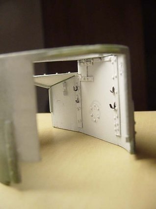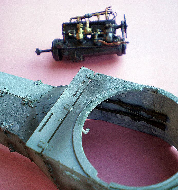 Ящики на модели показаны странно - на всех фото да и просто по логике - они должны окрываться наружу, так и Дог сделал, иначе дверцы корпуса в корме не открыть. Так что я развернул правый ящик, почему-то показанный в модели открывающимся внутрь. При аккуратной подгонке бронекорпус садится на место легко. Я сделал ось крышек капота и ручки на бронировке его боковин. Правая будет снята для обслуживания - по мне, с той стороны мотор выглядит интереснее.