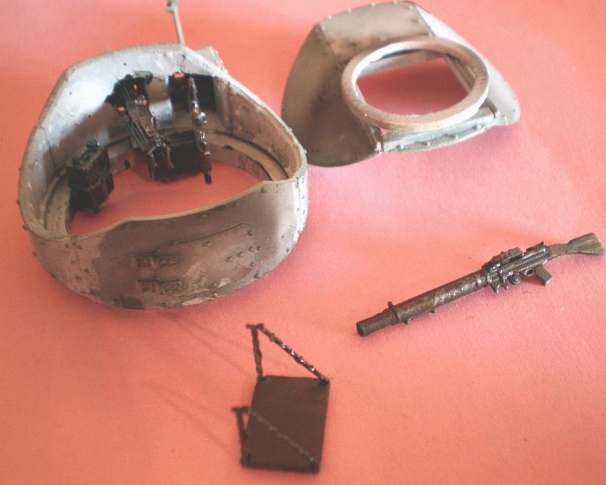 В башне через турель будет мало что видно... но я сделал и ручки на казенник смоляного Виккерса, сменившего убогий пулемет модели, и патронный ящик, и кусочек травленой ленты к нему. Канистра охлаждения пулемета есть в комплекте. Впрочем, эти все понты скроются - когда крыша встанет на место.