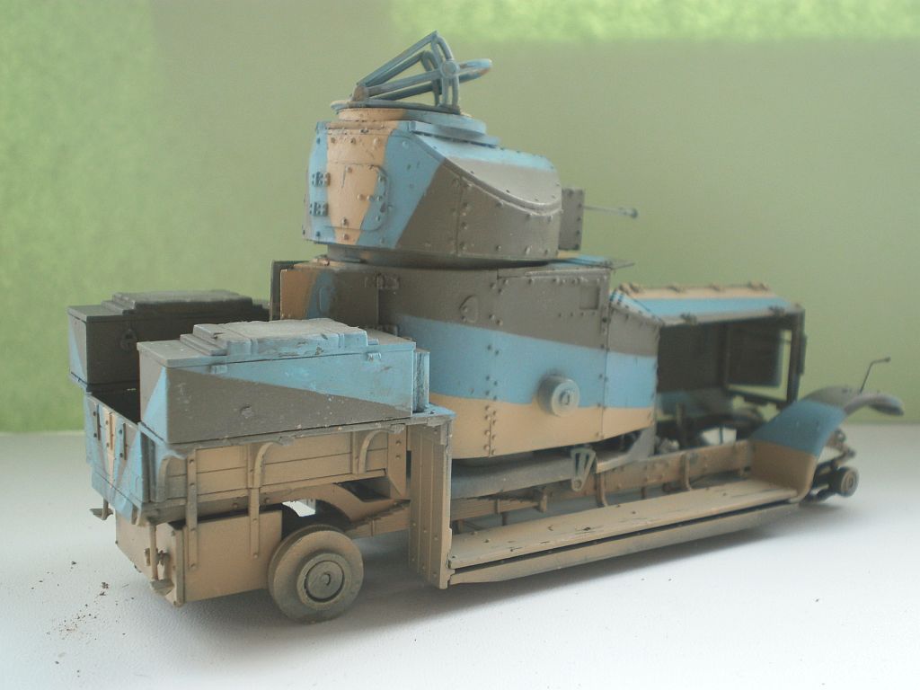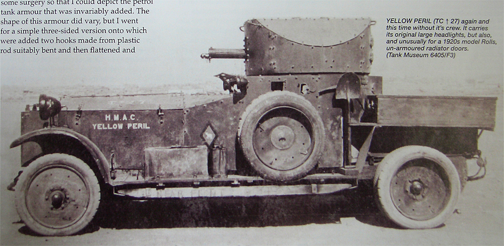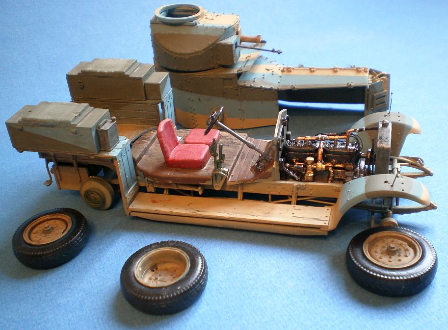 Ну, в ПМВ они участвовали именно на спицованных колесах. Поищите в Гугле видео по rolls royce armoured car - есть ролик и со съемками ПМВ (ссылку не найду), и 20-х. К сожалению, до ВМВ он не доходит. У самых ранних машин малый ящик на заднем крыле мог быть один, справа по ходу. Мои ящики, колеса и резина появились, вероятно, в конце 30-х (сужу по некоторым фото) - когда машины частью еще были просто хаки.